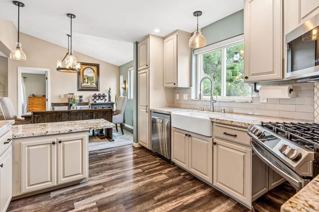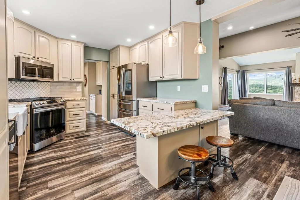Set on just over 3 acres of usable land in scenic Proctor Valley, this beautifully upgraded single-story home captures the essence of Jamul living with sweeping open space views, expansive skies, and a peaceful sense of privacy, all just minutes from the conveniences of Rancho San Diego. Completely renovated from top to bottom, this 3-bedroom, 2-bath residence blends comfort, efficiency, and thoughtful design. Vaulted ceilings create an airy, open feel, while luxury vinyl plank and tile flooring flow seamlessly throughout. The kitchen has been refreshed with newly painted cabinetry and premium stainless steel appliances, creating a clean, modern aesthetic that feels both elevated and functional. At the heart of the home, a wood-burning stove adds warmth and character, anchoring the living space with a cozy, inviting ambiance. A well-designed 2021 addition expands the home by approximately 300 square feet, introducing an additional bedroom, mudroom, built in storage area, and its own dedicated heating and cooling system, ideal for flexible living. Energy-efficient features, including solar-powered attic fans and dual-pane vinyl windows, enhance year-round comfort. Extensive system upgrades offer long-term peace of mind, including newer roofs on both the main home and detached oversized two-car garage with a workshop and office, PEX plumbing with hot and cold water manifolds, a 200-amp electrical panel that is solar ready, an EV-compatible outlet for modern convenience, durable Hardie board siding built to last generations, and fresh exterior paint. The property benefits from both well water and public water, providing added flexibility for rural living. Step outside and the lifestyle truly unfolds. A newly upgraded front deck creates inviting gathering spaces for quiet mornings and golden hour sunsets, while the backyard firepit is perfect for evenings beneath star-filled skies. The fully fenced, usable acreage offers exceptional versatility, whether envisioned as a homestead, space for animals, or future expansion with an ADU. A powered livestock shelter with running water is already in place, and four goats are included to naturally maintain the land. Mature fruit trees, including orange, grapefruit, nectarine, pomegranate, lime, and lemon, bring seasonal harvests and a sense of self-sustaining living. Positioned directly across from BLM land, this property offers immediate access to miles of open terrain for hiking, horseback riding, and mountain biking, extending the lifestyle far beyond the property itself. This is where open space, fresh air, and freedom define everyday living. A rare opportunity to own a fully upgraded home with acreage, offering space to grow, room to roam, and a lifestyle grounded in privacy, beauty, and possibility.