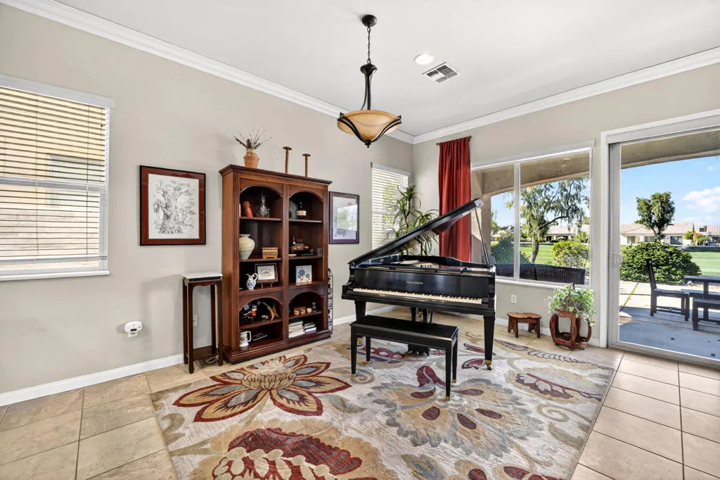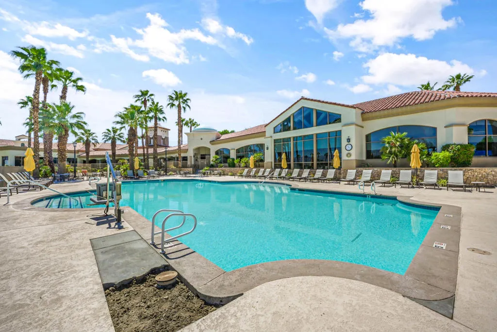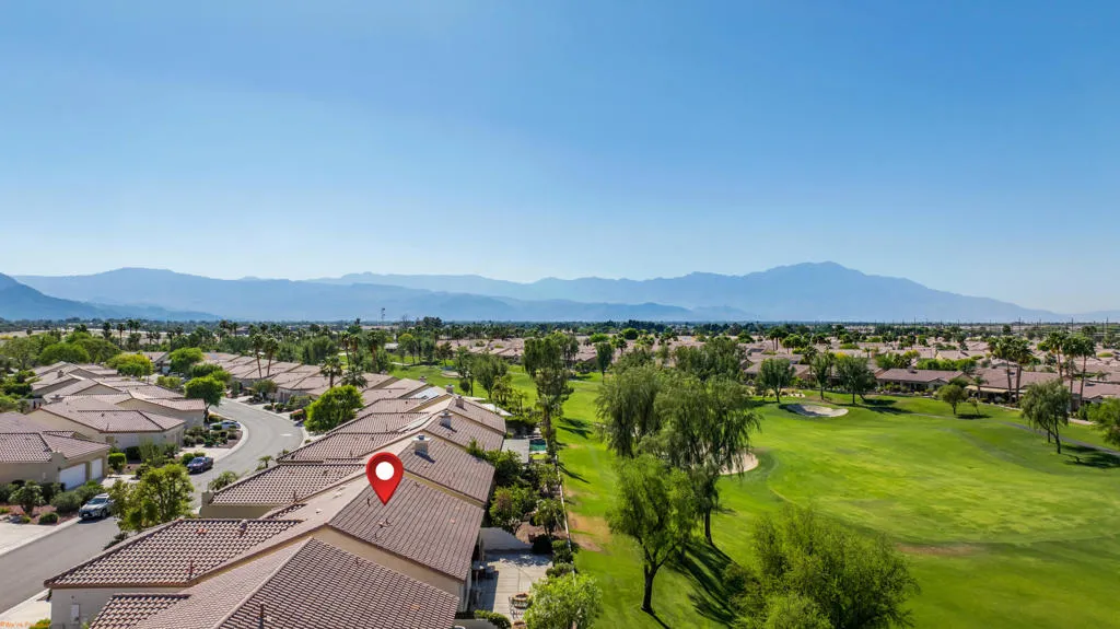 Positioned along the 11th fairway in the highly desirable 55+ community of Sun City Shadow Hills, this San Benito floor plan offers 2,147 square feet of refined desert living with breathtaking north-facing views of the golf course, lake, and surrounding mountains. From the moment you arrive, the private front courtyard creates a warm and inviting entry. Inside, the home opens to a spacious, light-filled layout designed for both comfort and entertaining. Expansive windows and sliding glass doors frame stunning outdoor vistas, seamlessly blending indoor and outdoor living. The great room is the heart of the home, offering an open flow into the kitchen and dining areas, while perfectly capturing the picturesque fairway and lake views beyond. The kitchen features granite slab countertops, abundant cabinetry, a breakfast bar, and a functional design ideal for hosting or everyday living. The primary suite is generously sized, offering a peaceful retreat with ample space, natural light, and a well-appointed en-suite bath with dual vanities, soaking tub, and walk-in shower. A guest bedroom and additional flexible living space provide comfort and versatility for visitors, a home office, or hobby room. Step outside to a covered patio and expansive outdoor living area where the views truly take center stage. Overlooking the lush fairway, tranquil water feature, and distant mountains, this is the perfect setting for morning coffee, evening sunsets, or entertaining under the desert sky. Set on a 6,534 square foot lot with direct golf course frontage, this home offers both privacy and panoramic scenery in one of the desert's premier active adult communities. Residents of Sun City Shadow Hills enjoy resort-style amenities including championship golf, clubhouses, fitness centers, pools, and a vibrant social lifestyle.