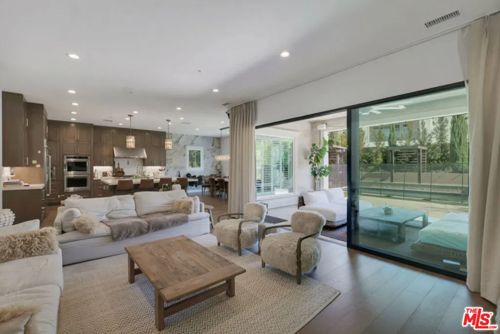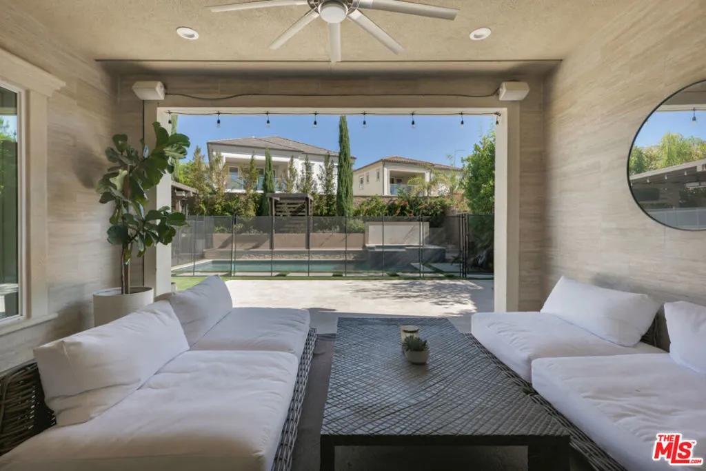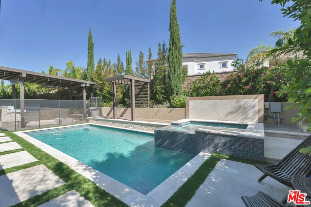 Experience elevated living in the prestigious Hillcrest community of Porter Ranch, featuring a 24-hour guard-gated entrance. Nestled on a quiet cul-de-sac, this modern 5-bedroom residence offers the perfect blend of comfort, style, and functionality ideal for both everyday living and entertaining. The resort-style backyard is a true showstopper, complete with an expansive linear pool, outdoor kitchen, fire pit, pergola, and multiple seating areas all designed for seamless indoor-outdoor living. Floor-to-ceiling stacking doors create effortless flow between the interior and exterior spaces.Inside, you'll find a custom dining room with built-in cabinetry and an elegant open-concept layout. The chef's kitchen is equipped with high-end KitchenAid stainless steel appliances, a spacious eat-in island, and a charming breakfast nook, all opening to a grand great room with soaring 12-foot ceilings. The main level includes a full bedroom and bathroom, a modern spiral staircase, and direct access to the two-car garage.Upstairs, the expansive primary suite offers a private balcony and extended sitting area. The spa-inspired bathroom features dual vanities with designer stone countertops, a glass-enclosed shower, and a separate soaking tub. Three additional bedrooms, a generous laundry room, and a versatile loft complete the second level. Located within walking distance to top-rated Porter Ranch Community School, the new 50-acre Porter Ranch Park, scenic hiking trails, shopping, dining, AMC theater, and Sierra Canyon School. This exceptional home will be move-in ready by May 1 don't miss this rare opportunity.