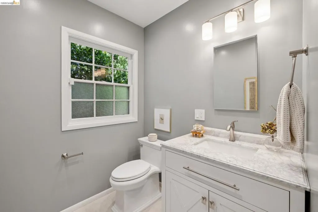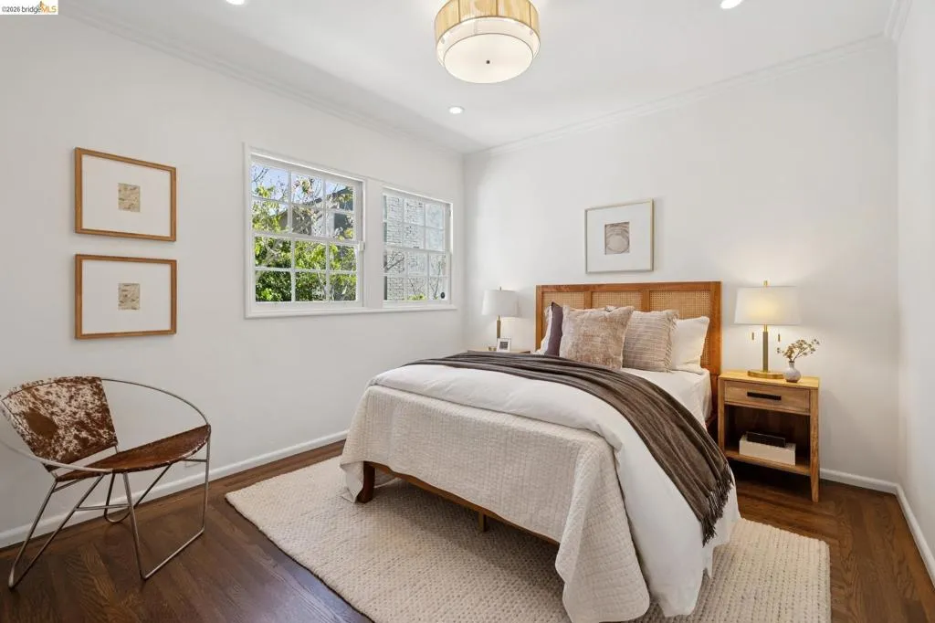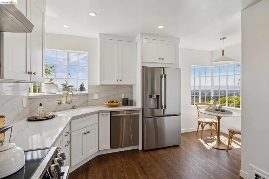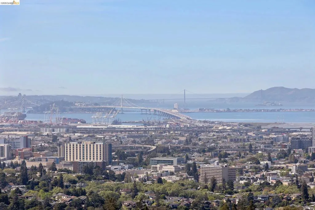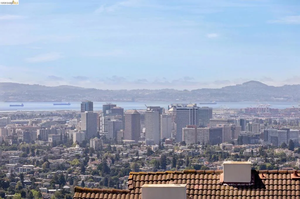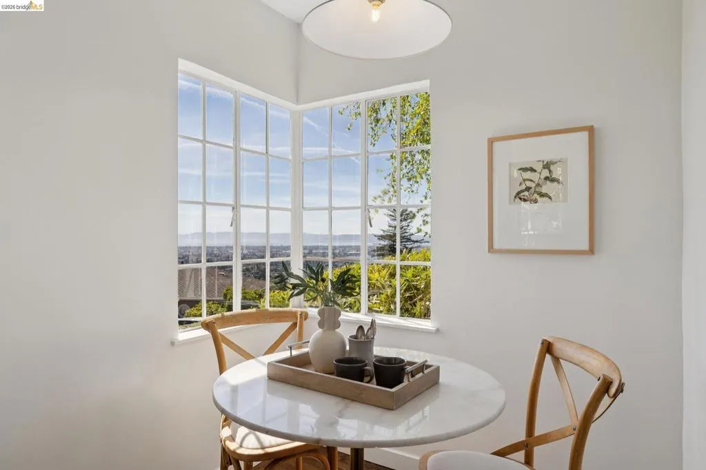This enchanting storybook traditional, commands sweeping San Francisco Bay views that unfold like a living painting, light, water, and skyline in constant motion. A compelling blend of timeless character and just-completed updates, the home pairs classic architecture with effortless livability. The main level features a striking living room with wood-hewn beams and rustic wood burning fireplace, a striking dining room oriented to capture the mesmerizing views, and a perfectly placed bedroom and full bath. Interior access to the attached two-car garage adds everyday ease. The newly renovated eat-in kitchen is a true centerpiece, with crisp new cabinetry, updated countertops, a new state-of-the-art induction range, and elevated designer finishes, overlooking a sunlit, level lawn, ideal for play or relaxation. Upstairs features three spacious bedrooms and two beautifully updated baths, with two bedrooms featuring versatile adjoining spaces and a primary set apart for a quiet retreat. A truly special offering, moments from Piedmont’s renowned schools, parks, and the soon-to-open community pool. Views: Downtown