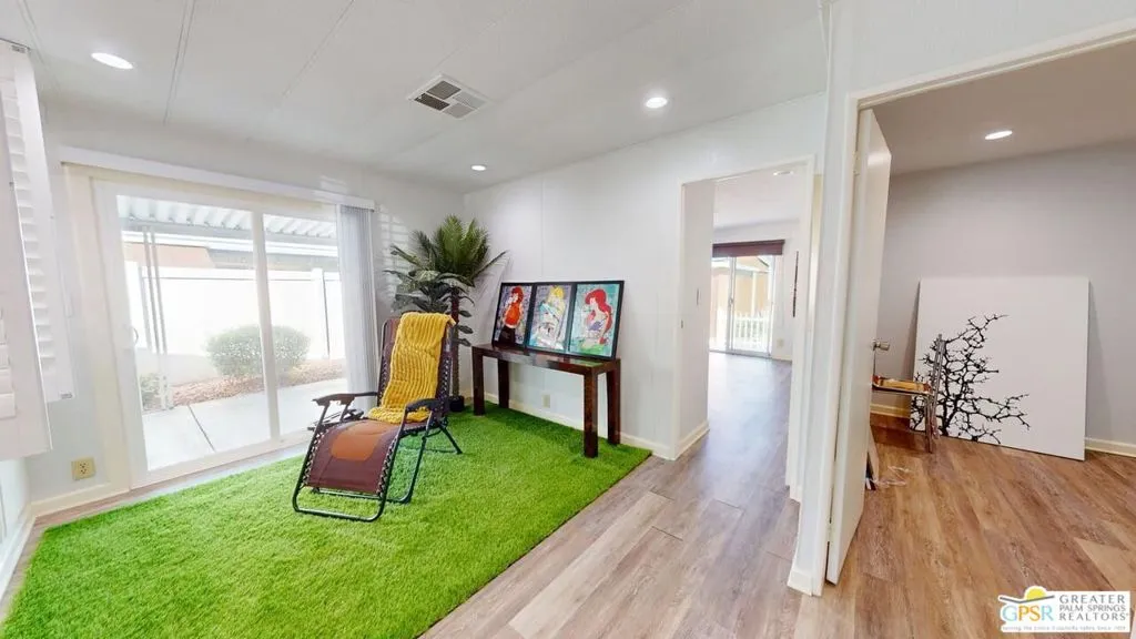 With Stunning Views of Mt. San Jacinto from the Living Room and Dining Room, this 2 Bedroom 2 Bath home has been nicely renovated. Currently used as an Artist's "Studio", this 1248sf home is ready for it's next adventure. Keep it as an Artist's "Studio" or use it as a residential property. The home features custom Plantation Shutters and plenty of public and personal spaces. The fenced patio features the wonderful view of Mt. San Jacinto as well. The home includes an in-unit stackable washer and dryer and Ceiling Can lights throughout, which add to the light and airy feeling of this great home. The monthly space rent includes a Clubhouse, 3 pools, water, trash and sewer. Palm Springs View Estates is conveniently located near Trader Joe's, Target, Bart's Bar and the new Eagle Bar to be opening in 2026. There are plenty of restaurants, golf and entertainment, especially at the Cathedral City Agua Caliente Casino and The Roost Bar. Palm Springs View Estates is a 55 plus community. Buyers must have park approval to close escrow. Contact the park manager for more details.