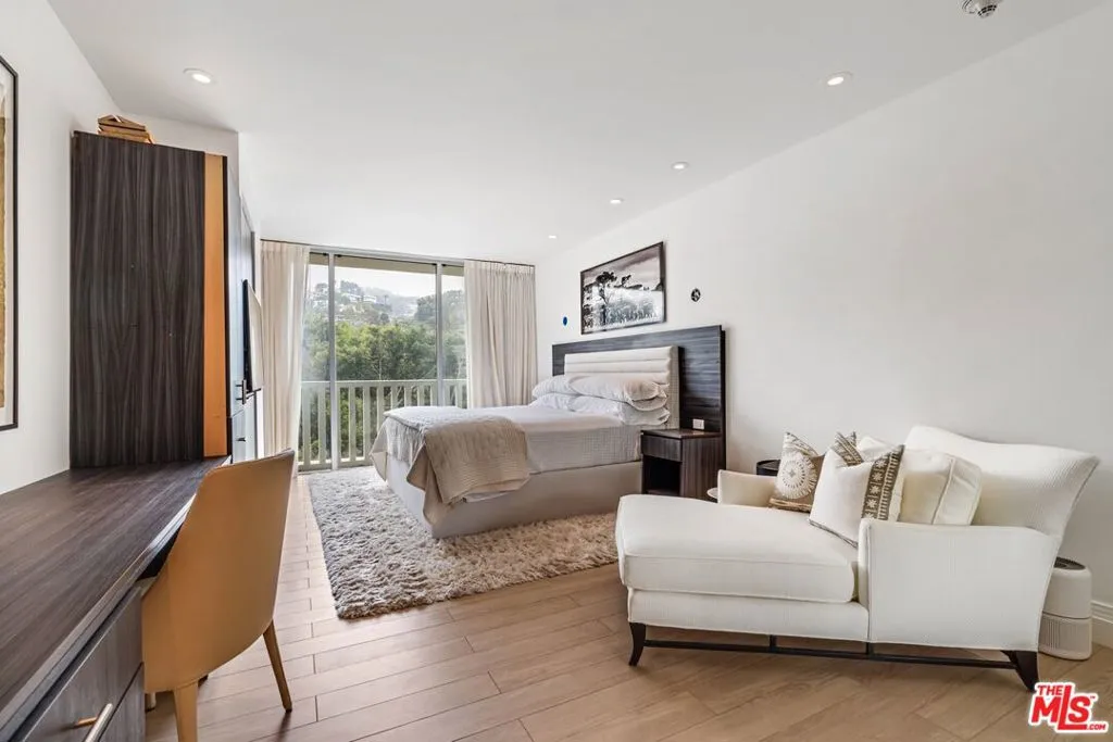 Refined style meets effortless California luxury in this beautifully updated residence at the iconic Sierra Towers, poised between Beverly Hills and the Sunset Strip. This serene one-bedroom home is quietly positioned overlooking the lush Hollywood Hills greenery. A formal entry opens to expansive living spaces with a wall of sliding glass doors leading to a large private terrace, ideal for dining, a sunset cocktail or for reading a book while lounging under the LA sky. The dining area flows into a remodeled kitchen featuring quartz countertops, stainless steel appliances, generous storage, a casual seating area, and a full laundry room. The spacious primary suite enjoys tranquil hill views and lounge area, a walk-in closet with tailored storage, and a spa-like bath with stone finishes. Additional highlights include wide-plank wood-look tile flooring, central heat and air, two entry closets, and a powder room. Residents enjoy world-class amenities: 24-hour concierge, valet and doorman service, a sparkling pool, spa, and a fully equipped fitness center. Located just minutes to world class dining and shopping in Beverly Hills and West Hollywood providing a rare opportunity to live where timeless sophistication meets ultimate convenience.