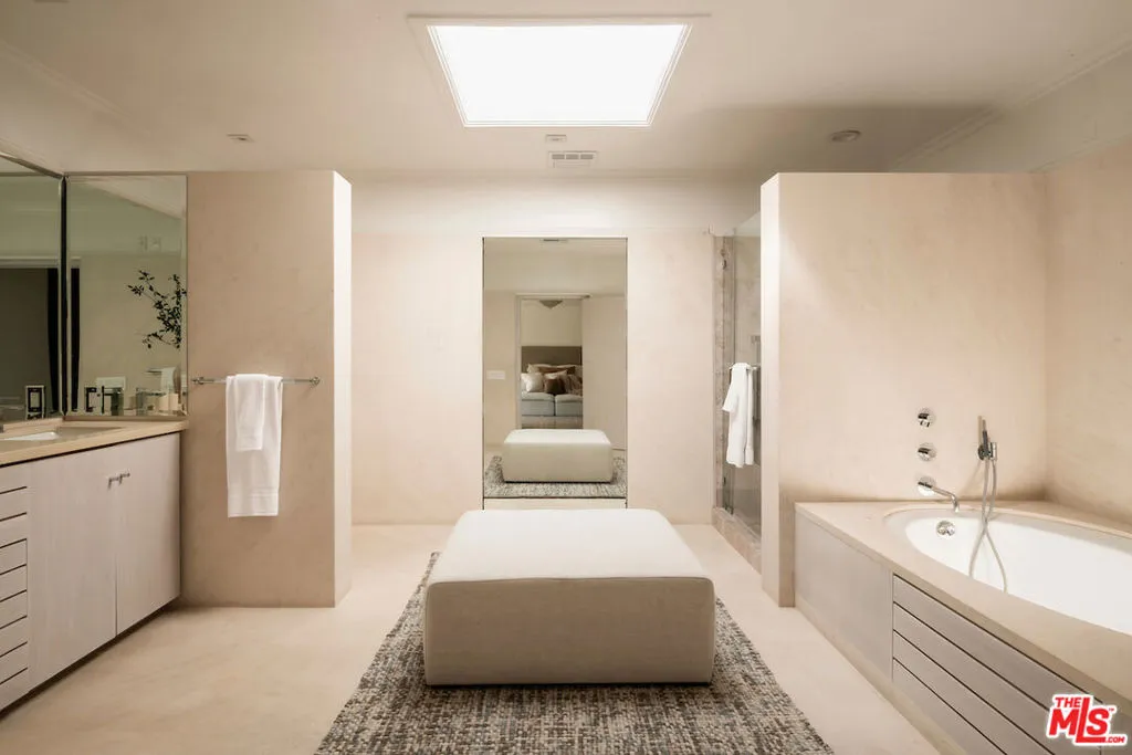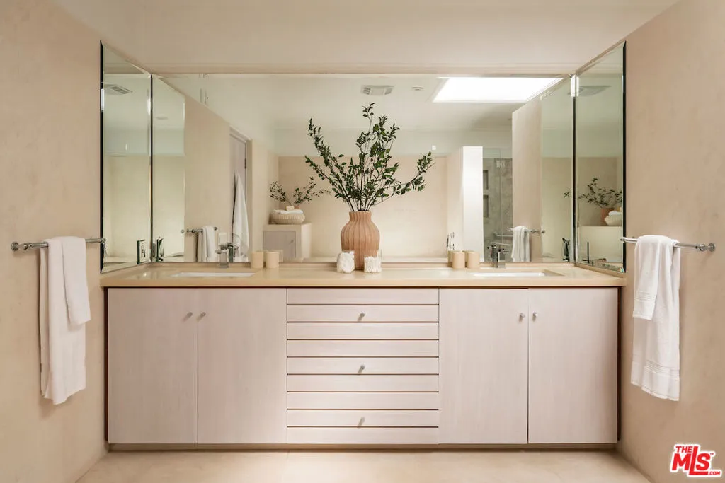 Situated in the coveted lower Trousdale Estates of Beverly Hills, this gated Mid-Century residence offers single-level living on a sprawling 21,600-square-foot lot. Clean architectural lines and a refined, open layout define the interiors, offering a seamless blend of classic design and modern livability. A formal entry unfolds into a refined composition of living spaces, including a formal living room with fireplace, an intimate den with a second fireplace, and a formal dining room, each framed by walls of floor-to-ceiling glass and sliding doors that bathe the interiors in natural light while seamlessly dissolving the boundary between indoors and out. The newly updated kitchen is both functional and striking, featuring dual islands, top-tier appliances, and a substantial walk-in pantry. A private office is thoughtfully integrated into the layout. The main residence comprises four bedrooms, anchored by an expansive primary suite offering dual walk-in closets and a spa-caliber en-suite bath appointed with a soaking tub, separate shower, and a generously scaled vanity. A detached approximately 950-square-foot guest house with one bedroom and one bathroom provides a private and well-appointed retreat for guests. The grounds evoke a tranquil, resort-like setting, enveloped by mature landscaping and dotted with abundant citrus trees that enhance both privacy and ambiance. A large pool with a diving board serves as the focal point of the outdoor experience, complemented by a covered patio with fireplace and a fully equipped outdoor kitchen designed for effortless al fresco living and entertaining. Subtle peek-a-boo city views complete the offering. A rare opportunity to own a timeless Mid-Century residence in one of Beverly Hills' most prestigious enclaves, moments from the city's finest dining, shopping, and entertainment.