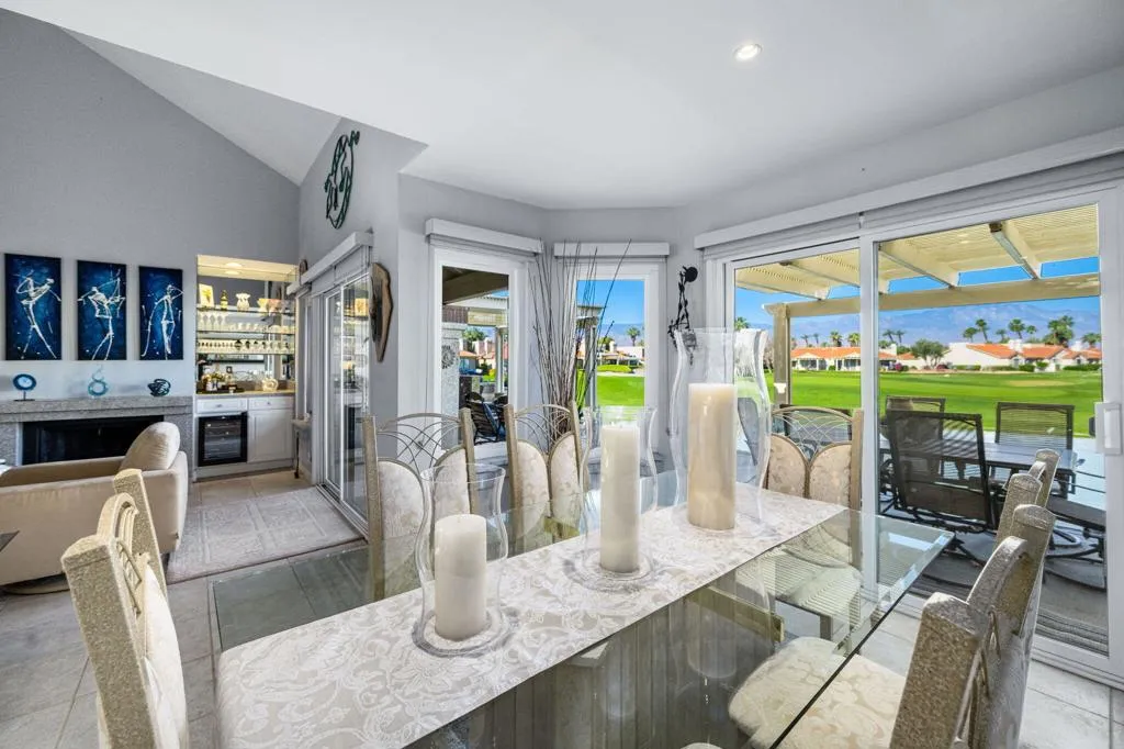 Rare opportunity on the golf course side of highly sought-after Avellino Circle in guard-gated Desert Falls Country Club. Thoroughly remodeled, this exceptional condo captures stunning views of shimmering water, multiple fairways, and dramatic mountain backdrops.Offering 2 bedrooms and 2 baths, the home has been thoughtfully updated for effortless desert living and entertaining. The remodeled kitchen features quartz countertops, updated cabinetry, and a beverage fridge, opening to the dining area and rear patio for easy indoor-outdoor flow.Both bathrooms have been beautifully remodeled with floor-to-ceiling tiled showers, quartz countertops, and updated cabinetry. The spacious primary bath features a large walk-in shower with distinctive glass block detailing. The entry to the expansive primary suite has been reconfigured to enhance privacy, while the enclosed atrium fills the home with natural light and creates a charming portico leading to the primary bedroom.Outdoors, the extended back patio offers three distinct seating areas, ideal for intimate gatherings or larger-scale entertaining against a spectacular view backdrop. A portion of the garage has been finished as a man cave/lounge area with a wall-mounted TV, adding flexible bonus space.A rare view property in one of Palm Desert's most desirable communities, just minutes from El Paseo, fine dining, premier shopping, and Acrisure Arena, home of the Coachella Valley Firebirds and a major venue for concerts and events. Desert Falls Country Club is privately owned and offers both pay-as-you-play and membership options.