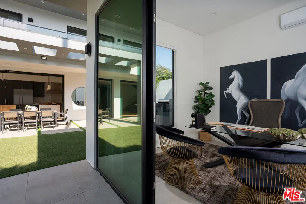 A stunning modern residence set on an expansive, flat lot. This 5-bedroom, 6-bath oasis was thoughtfully designed to combine open-concept living with generous space for both entertaining and privacy. Enter through the 10-foot entry door into an open layout featuring wide-plank European oak floors, high ceilings throughout, and a custom floating glass staircase. The main living area flows seamlessly between the formal dining room with built-in buffet, the living room centered around a floor-to-ceiling marble fireplace, and a contemporary kitchen showcasing custom cabinetry, quartz countertops, high-end appliances, and dual islands designed for gourmet cooking and entertaining. The primary suite serves as a private retreat, featuring a marble fireplace, balcony overlooking the yard, spacious walk-in closet, and a spa-inspired bathroom. Full-length glass pocket doors open to a resort-style backyard with a zero-edge pool, spa, fire pit, built-in grill, and a pool house with its own bath offering the potential for conversion to an ADU, private recording studio, office, or creative workspace. A guest bedroom is conveniently located on the main level, while upstairs features additional bedrooms including a guest suite, a lofted landing with custom built-ins, and a spacious gym that can also serve as an additional bedroom. The upper level also includes a home theater with its own bath, providing flexibility to be used as another bedroom or entertainment space. A well-appointed laundry room adds everyday convenience. Upgrades include electric blinds, a smart home system, custom lighting, security cameras, and more. This exceptional home seamlessly blends luxury, functionality, and style, offering an unparalleled living experience.
