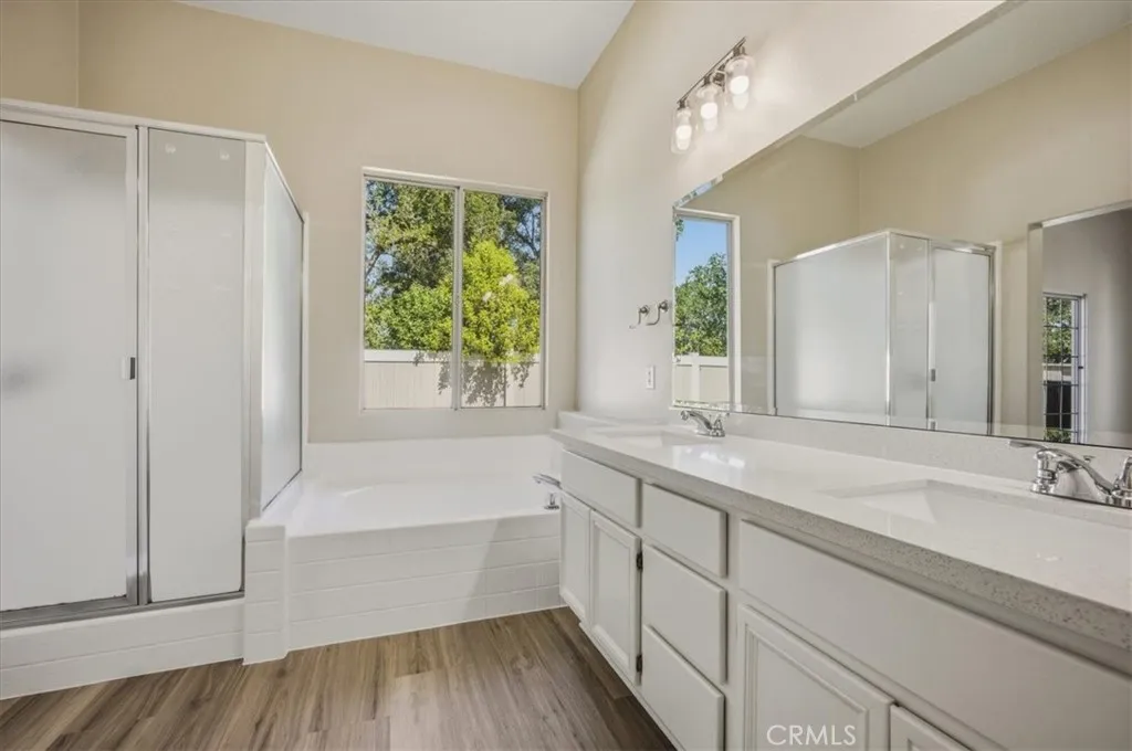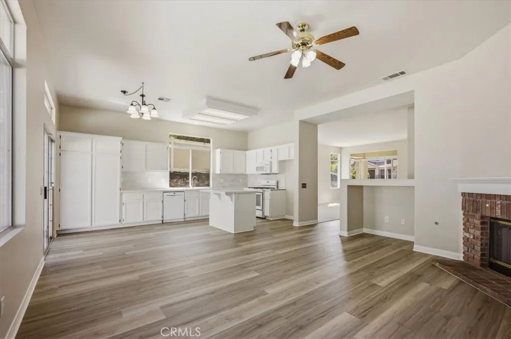Welcome to this beautiful single level home, nestled in the hills of North Yucaipa! From the moment you arrive, you’ll appreciate the inviting curb appeal featuring a lush green lawn, mature foliage, a charming walkway leading to the front door, and a covered front patio—perfect for relaxing or creating a cozy seating area. This spacious home offers an attached three-car garage and a thoughtfully designed layout filled with natural light. Upon entry, you are greeted by large windows that brighten the space, along with a formal living room and dining room to the right—ideal for entertaining. The home is enhanced with new luxury vinyl flooring and designer sculpted carpeting throughout, adding both style and comfort. As you continue through the home, you’ll find an open-concept living area where the kitchen and family room seamlessly come together. The kitchen features crisp white cabinetry with ample storage, gleaming quartz counter tops, a center island with barstool seating, and space for an eat-in dining area. Large windows over the sink provide lovely views of the backyard. The adjoining living room showcases a beautiful brick fireplace with a decorative mantle, creating a warm and inviting atmosphere. Down the hallway, you’ll find a convenient linen closet and four generously sized bedrooms, each offering great space and storage. The primary suite is a true retreat, featuring double-door entry, an open layout, and sliding glass doors that lead to the backyard. The en-suite bathroom includes a double sink vanity, soaking tub, separate shower, and a spacious walk-in closet. Additional highlights include an indoor laundry room with direct access to the garage for added convenience. Step outside to a clean, minimalist backyard surrounded by greenery—offering endless possibilities for outdoor living, entertaining, or customization to fit your lifestyle. This home combines comfort, functionality, and charm—don’t miss the opportunity to make it yours!