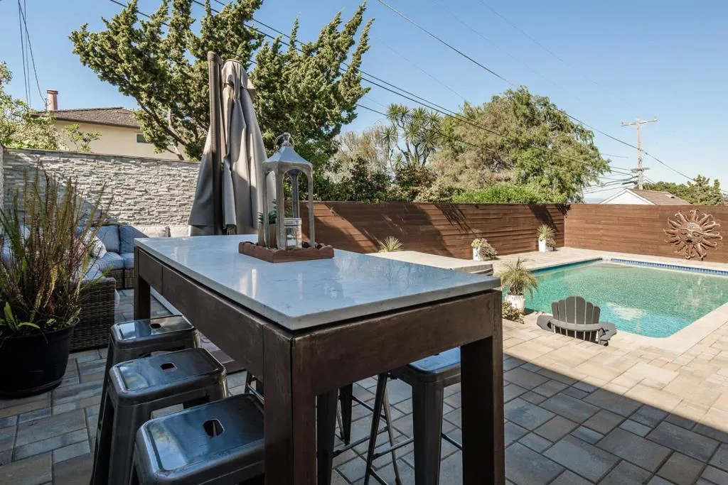 Welcome to a masterfully reimagined residence where modern sophistication meets the effortless comfort of California living. This home was expertly transformed to prioritize light, greeting you with an open floor plan anchored by gleaming hardwood floors that catch an abundance of warmth. The heart of the home is a show-stopping central kitchen a chefs dream designed for high-end catering and casual morning coffee. Centrally positioned, it is elegantly flanked by a dining area and an inviting family space, creating a seamless "Great Room" effect. Whether you are hosting gala-style events or enjoying quiet evenings by the fire, the flow is both intuitive & grand. Bridging style and function, the home features a custom-designed mudroom. This thoughtful addition serves as the ultimate transition space, keeping daily essentials organized so the main living areas remain pristine. The layout includes three generous bedrooms and three full bathrooms, each offering a private sense of retreat with updated contemporary finishes. Your private dream awaits outside. The backyard is a shimmering sanctuary, featuring a sparkling pool and an expansive patio for alfresco dining. Located minutes from parks and boutique shopping, this is more than a renovation its a total lifestyle upgrade.