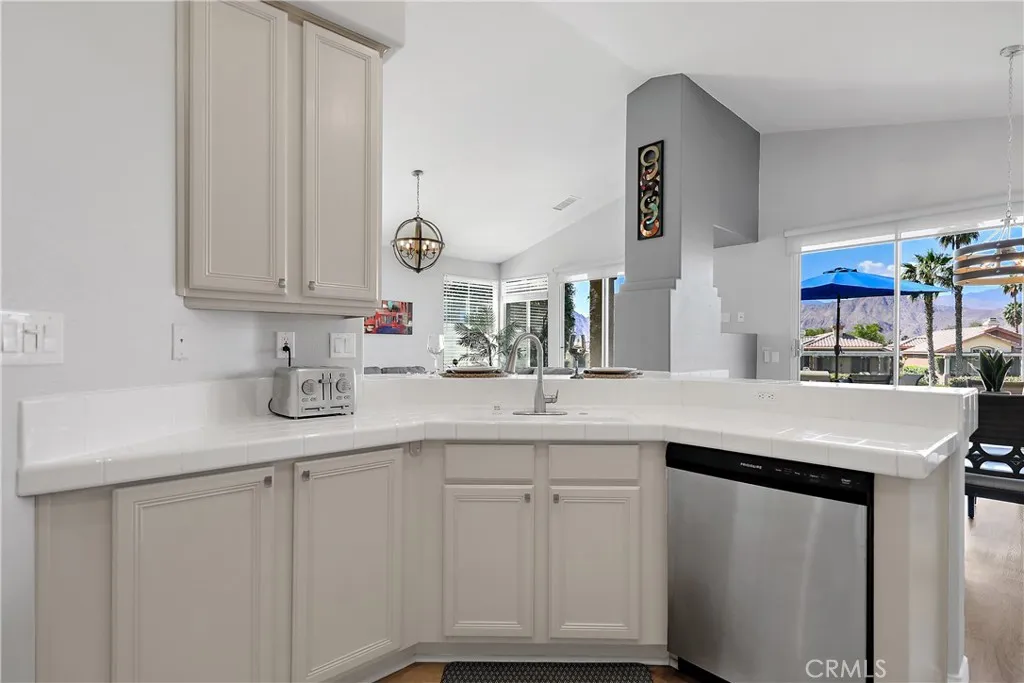 Beautifully positioned on the 4th hole within a guard-gated community, this fully furnished single-story residence offers exceptional mountain, golf course, and pond views. The home features a bright and open floor plan with large windows and sliding glass doors that provide natural light and direct access to the private patio, ideal for enjoying the surrounding scenery. The property is offered fully furnished and includes brand-new appliances throughout along with luxury vinyl flooring. The interior features 2 bedrooms and 2 bathrooms, a spacious living and dining area, high ceilings, and a three-sided fireplace. The primary suite includes an en-suite bathroom and walk-in closet. Additional features include an attached 2-car garage +golf cart garage space and a quiet cul-de-sac location. The outdoor patio overlooks the golf course and tranquil pond with panoramic mountain views beyond. Community amenities include pickleball, golf, country club, fitness center, meeting room, restaurant/bars, multiple pools and spas, greenbelts, and walking paths. Conveniently located near shopping, dining, golf, and the Indian Wells Tennis Garden.