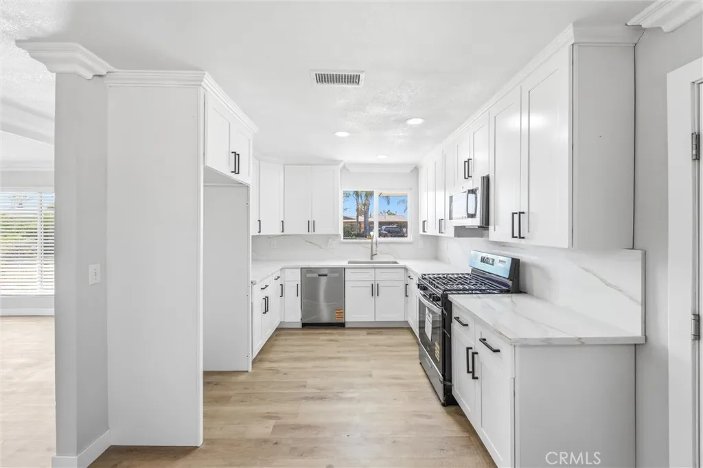 Welcome to single-story home upgraded throughout, offering 4 bedrooms and 2 bathrooms with approximately 1,820 sq ft of living space. This move-in ready residence features a fully open floor plan with spacious living areas designed for comfort and modern living. A standout feature is the expansive bonus room with two French doors, providing natural light and flexible use as a playroom, entertainment, game room, studio, or home office. The beautifully updated kitchen includes new cabinetry, granite countertops, a brand-new sink, and dishwasher. The entire home showcases new vinyl flooring, complemented by ceiling fans throughout for added comfort. Both bathrooms have been fully renovated with brand-new tubs and fixtures. Major system upgrades include a new HVAC system with updated ductwork and a brand-new water heater, offering efficiency and peace of mind. The attached two-car garage is fully drywalled, & epoxy flooring, features a new garage door opener, and includes French door access to the backyard. With no HOA and close proximity to freeway access, this home combines convenience, style, and functionality.