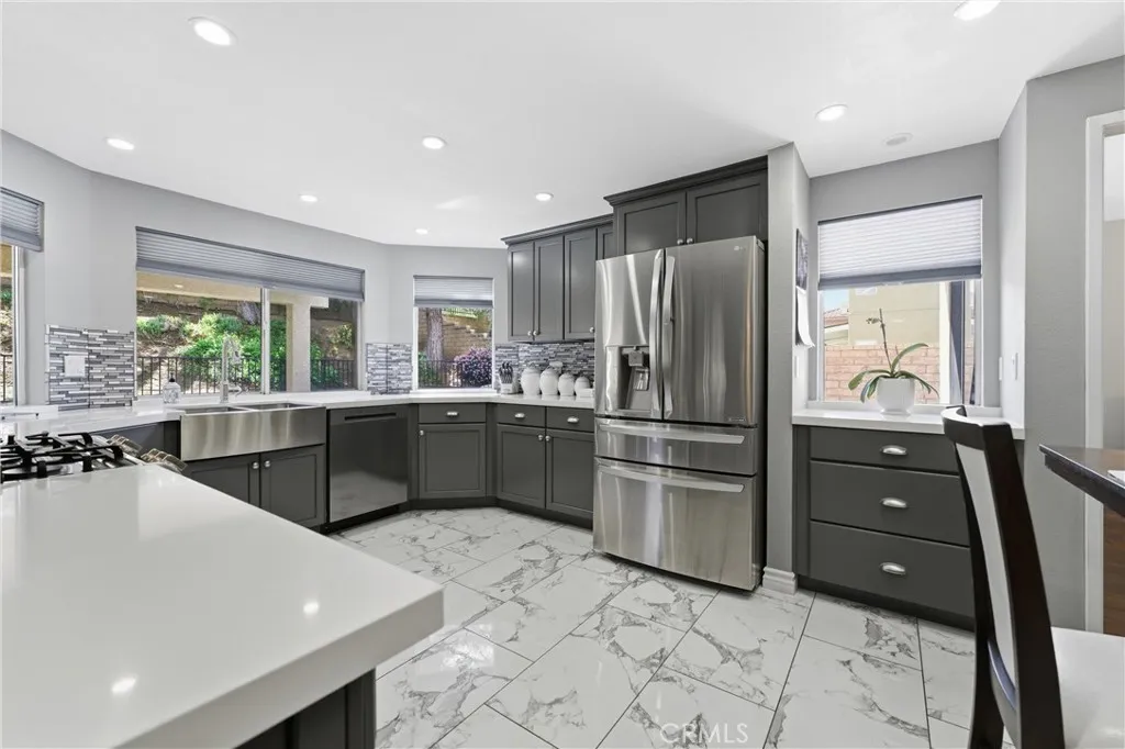 Spectacular West Palmdale pool home with RV/trailer parking, extensive remodeling, and exceptional pride of ownership. Offering 4 bedrooms, 3 bathrooms, and approximately 2,815 square feet of living space, this beautifully updated home stands out for its quality, attention to detail, and truly move-in ready condition. Custom hardwood leaded-glass double entry doors welcome you into a bright, elegant interior with vaulted ceilings, plantation shutters, and engineered hardwood flooring. The remodeled chef's kitchen features custom cabinetry, quartz countertops, decorative tile backsplash, stainless steel appliances, a farm sink, tile flooring, and a sunny seating area, all opening to the inviting family room. Step outside to a private, lushly landscaped backyard designed for entertaining, complete with a large custom patio cover, generous seating areas, and a sparkling pool with a peaceful waterfall, fully fenced for added safety. Upstairs, the spacious primary suite offers hardwood flooring, a sitting area, fireplace, and a beautifully remodeled spa-like bathroom with custom cabinetry, quartz counters, dual sinks, makeup vanity, soaking tub, large shower, and walk-in closet with matching built-ins. Two additional upstairs bedrooms share a Jack-and-Jill bath, while a downstairs bedroom and full bath with direct access to the pool area offer flexibility for guests or multigenerational living. Additional highlights include updated HVAC approximately 5 years ago, roof underlayment replaced in 2015, newer custom stamped concrete, exterior paint completed within the last year, and a spacious 3-car garage with epoxy floors, insulated garage doors, openers, and storage cabinets. Conveniently located near shopping, schools, and hiking, this one-of-a-kind home offers the perfect blend of comfort, style, and function.
