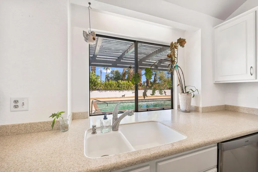Absolutely immaculate South Palm Desert home tucked away on a quiet street with beautiful mountain views. The beautifully landscaped front entry and private patio create an inviting first impression. Inside, the spacious living room features vaulted ceilings, a dining area, and French doors that open to the rear yard for seamless indoor-outdoor living. The separate family room offers a cozy fireplace and another set of French doors leading to a charming side patio. Just off the family room, the breakfast area and kitchen overlook the expansive backyard. The peninsula kitchen is finished with oatmeal-toned Corian countertops and newer appliances. The split-bedroom floor plan provides ideal privacy, with the primary suite enjoying direct backyard access through French doors, a walk-in closet, upgraded vessel sinks, and custom water fixtures. The backyard is truly an entertainer's retreat, featuring a large pebble-finish pool and spa surrounded by breathtaking west-facing mountain views, along with stunning north and east views of the Little San Bernardino and Eisenhower Mountains. This is a special home that must be seen to be fully appreciated.