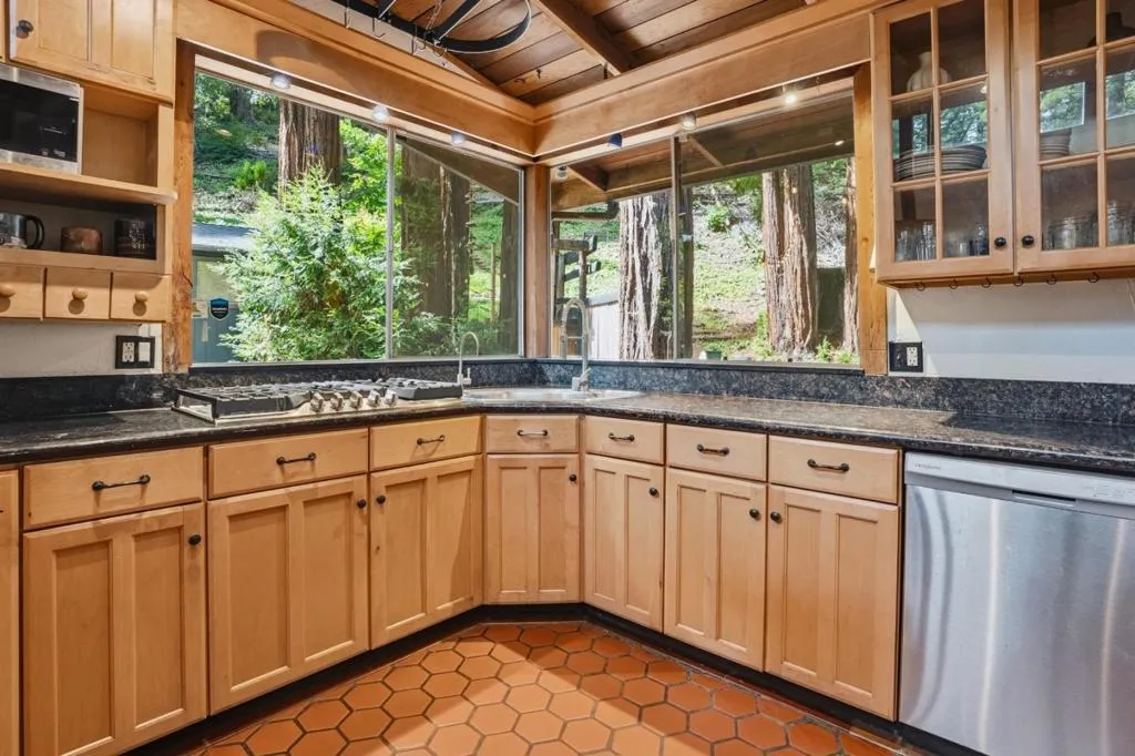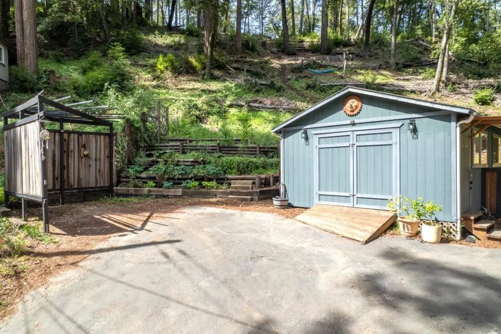 Rare opportunity to assume a 2.75% VA loan with an approximate balance of $785,000 significantly below current market rates. Nestled in the redwoods of Brookdale, this mid-century modern 2BD/2BA cabin with a spacious loft features soaring windows, abundant natural light, and a seamless connection to nature. The updated kitchen includes all new appliances, complemented by a wood burning stove and new furnace for year-round comfort. Set on a private 0.91-acre lot, the property offers exceptional outdoor living with extensive fire-hardening, hardscaping, and curated landscaping. Enjoy an outdoor kitchen, hot tub, and multiple entertaining spaces. A large, flat upper area with fire road access provides potential for future development (buyer to verify). Additional highlights include: a new roof with a 10 year warranty, enclosed shed/workshop and additional garden shed, ample off-street parking, and basement storage. A turnkey mountain retreat combining modern upgrades, usable land, and a rare financing advantage just minutes from town and an easy commute to Santa Cruz or Silicon Valley.