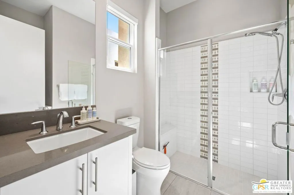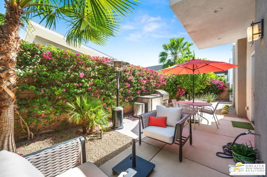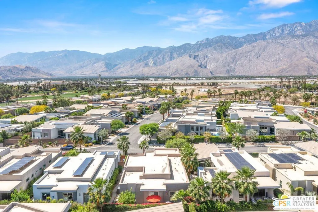Located in the guard-gated golf course community of Escena, this contemporary home blends luxury, comfort, and effortless desert living. Clean lines, expansive glass, and high-end finishes set the tone, while the open-concept design creates seamless indoor-outdoor flow. The gourmet kitchen features stainless steel appliances, modern white cabinetry, and a large island perfect for gathering. The great room is filled with natural light from floor-to-ceiling windows, framing beautiful mountain views.The primary suite offers a spa-like bath with soaking tub, walk-in shower, dual vanities, and a spacious walk-in closet. A separate TV room and powder bath provide privacy between the primary and secondary en-suite, which includes a built-in office and Murphy bed. New carpet in the bedrooms adds a fresh, move-in-ready touch. Step outside to your private retreat where the pool and spa take center stage, perfectly positioned to capture stunning, unobstructed mountain views. With a built-in BBQ and inviting patio, it's ideal for relaxing or entertaining under the desert sky. Additional upgrades include built-in speakers, designer lighting, motorized shades, and more. A true Escena gem offering the best of Palm Springs living.