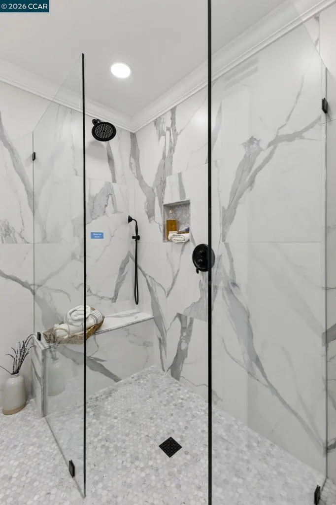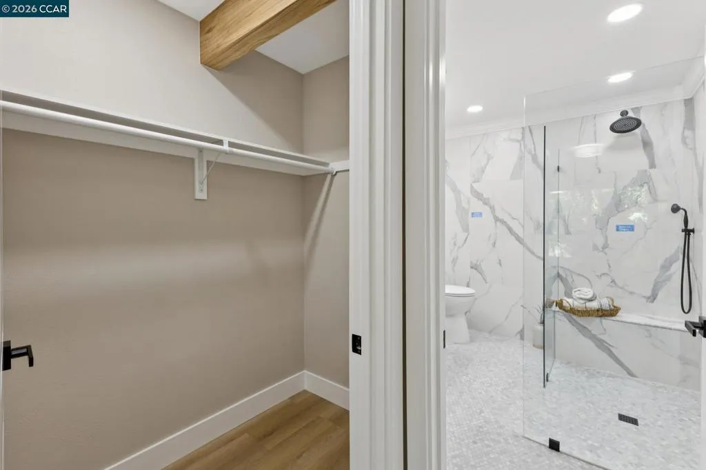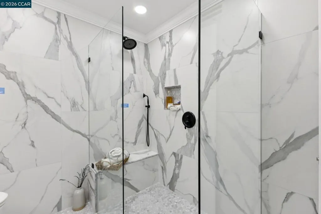 The Walke Inn is a beautifully reimagined, fully renovated home designed for both elegance and comfort in the heart of Rossmoor’s 55+ community. Expertly updated by Fred Rooster Renovations, this Sonoma model features thoughtful design and modern touches throughout. At the heart of the home is an inviting open concept kitchen with a large island with seating, oversized farmhouse sink, induction range with pot filler, quartz countertops, and a full-sized pantry closet for ample storage. Milgard dual-pane windows and a large rear patio door flood the space with natural light, while high-end finishes create a warm, upscale feel. The primary suite boasts an expansive layout featuring a massive walk-in closet and a luxurious en-suite bath with a retiree friendly curbless walk-in shower. A second full bathroom includes another walk-in shower with built-in seat. Additional features include in-unit full-sized laundry, a front door smart lock, and a layout ready for a minimalist lifestyle. Step outside to enjoy the huge balcony—perfect for relaxing or entertaining. From stylish finishes to smart upgrades, every detail has been considered.