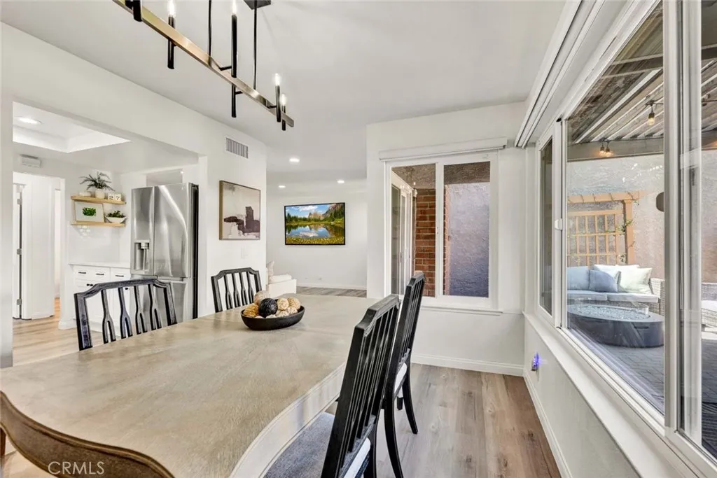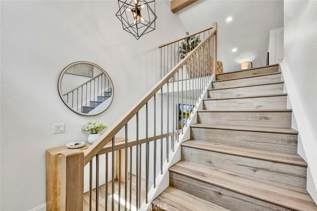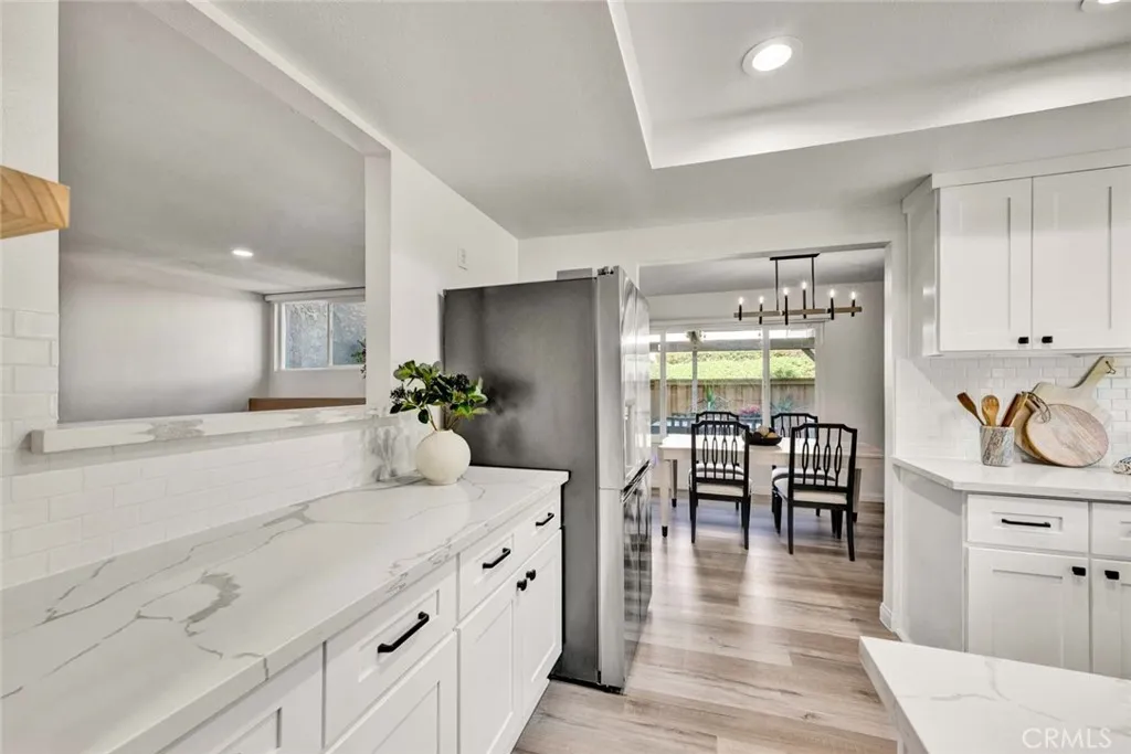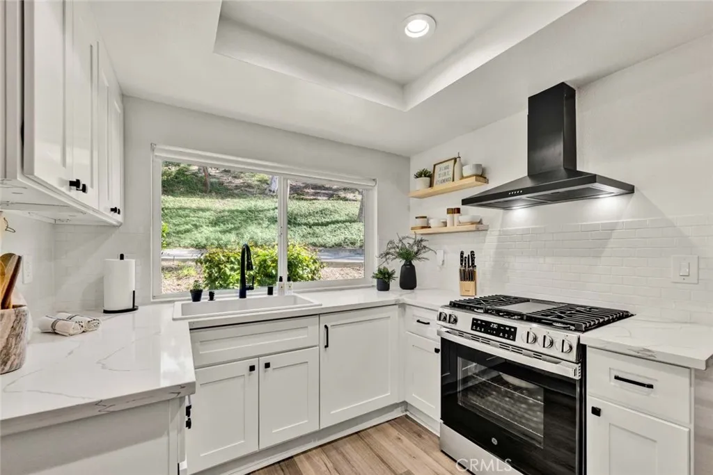 Beautifully remodeled single-family attached home in the highly sought-after Parkview community of Anaheim Hills, ideally located adjacent to the Anaheim Hills Golf Course. Offering approximately 1,550 sq. ft., this light-filled residence features 3 bedrooms and 3 bathrooms with a thoughtfully updated, open-concept floor plan. The main level includes a bedroom and a full bathroom with dual access from both the hallway and bedroom. The fully remodeled kitchen showcases white shaker cabinetry, white quartz countertops, subway tile backsplash, stainless steel oven, and a sleek black vent hood, seamlessly opening to the dining area—perfect for everyday living and entertaining. The living room features a remodeled stone fireplace with hearth, recessed lighting, and new windows throughout, enhancing the home’s bright and modern feel. Upstairs offers a spacious loft area and two additional bedrooms, including the primary suite with double door entry and custom closet organizers. Each upstairs bedroom features its own private vanity area, while sharing a centrally located shower and toilet room, providing both privacy and functionality. Both vanities have been tastefully updated with white oak cabinetry, quartz countertops, and modern lighting. Additional upgrades include new light oak laminate flooring throughout, recessed lighting, and an updated staircase. The backyard features a covered patio with concrete slab, ideal for outdoor enjoyment. The home also includes a 2-car attached garage with direct access, with laundry conveniently located in the garage. Residents enjoy access to community pool, lush greenbelts, and mature trees.