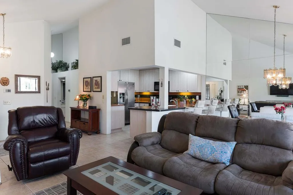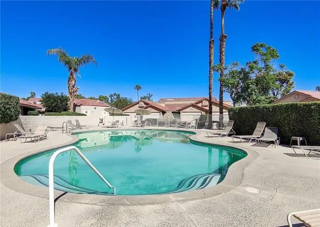 Upon entering this well-kept and updated home you immediately notice the high volume ceilings. The 2 Bedroom / 2 Bath unit is Light and Bright with an open floor plan. The kitchen has Corian Counters and a full array of appliances. The Dining and Living Rooms are adjacent and have a full wall of glass to see the expansive North facing Patio area. This large outdoor space overlooks the wide Fairway and features the Little San Bernardino Mtns. The outdoor living is great for morning coffee or afternoon beverage with family and friends. As you continue through the unit, there is a guest bedroom with a full bath across the hall which features a laundry area and a full-sized stacked Washer/Dryer. At the end of the hall, is the Primary Suite with a large walk in closet, dual vanities and a large step-in shower. The interior location within the community is quiet and is ready for move-in. Being sold furnished per inventory. There is a nice two car garage streetside which has ample room for two vehicles and extra storage. The Woodhaven Community has 18 holes of challenging golf, also featuring tennis and pickle ball, along with 4 pools/spas, Restaurant, Gym and Pro Shop. The $795 monthly HOA Dues, covers Roof, Front Gate, Exterior Paint, Landscaping, Pest Control, Garbage, Bldg Ins. as well as Spectrum Cable/Internet. Check out this centrally located Country Club Community with easy freeway access on Washington St and close to shopping and local restaurants. You will not be disappointed, make an Offer TODAY!!