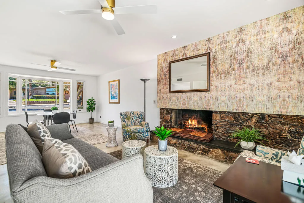 This renovated Mid-Century residence in the well-located Magnesia Falls neighborhood offers a welcoming open-concept interior and two private outdoor entertainment areas, with mountain cove views enjoyed from the patio off the primary bedroom.The current owner has thoughtfully improved the property, including stained concrete flooring, retextured interior walls, and a custom-designed iron front door. The kitchen has been upgraded with a European-inspired design, featuring new cabinetry, a designer tile backsplash, stainless steel appliances with range hood, and sleek stone countertops.The remodeled bathrooms include a brand-new spacious walk-in shower in the primary suite, a tiled guest bath, upgraded hardware, and newer vanities. The open living and dining areas are anchored by a striking rock fireplace with an extended tile facade reaching to the ceiling.Outdoor spaces are designed for low maintenance, with artificial turf, mature trees, patio coverage, and room for gardening. Additional features include a two-car garage with an expansive driveway, a dedicated laundry room, and two guest bedrooms.Magnesia Falls is ideally located just south of Historic Highway 111, offering convenient access to dining, shopping, and daily amenities, all with the benefit of no HOA.