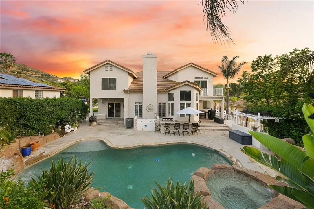 Welcome to this stunning POOL/SPA home located in the highly desirable, guard-gated community of Canyon Lake. Situated on a large, private lot on a quiet street, this expansive residence offers 4 Bedrooms PLUS a dedicated office, 4 Bathrooms and a 3-car garage! Designed for both comfort and entertaining, the home features multiple covered patios, including a front-facing patio, a side patio, and dual backyard access points. Enjoy your own private retreat with a secluded patio and a spacious deck off the primary suite. The open and inviting kitchen is equipped with granite countertops, ample cabinetry, a walk-in pantry, and large windows adorned with plantation shutters, filling the home with abundant natural light. The main level showcases beautiful wood flooring, while the upstairs features stylish LVP flooring throughout. Upstairs, you’ll find three additional bathrooms, including a fully remodeled primary bathroom complete with a freestanding soaking tub, oversized walk-in glass shower, white cabinetry, shiplap accent walls, and modern black finishes. No more lugging your laundry downstairs, this home features your very own laundry chute! Step outside to your resort-style backyard, featuring a sparkling pool and spa with dramatic double waterfall features, a built-in barbecue island with refrigerator, and breathtaking sunrise and sunset views. Located in the heart of Canyon Lake, residents enjoy 24-hour guard-gated security and access to an array of amenities including boating, fishing, water sports, parks, community events, equestrian facilities, and multiple sports courts. If you’ve been searching for a spacious Canyon Lake pool home with exceptional features and resort-style living, this is the one.