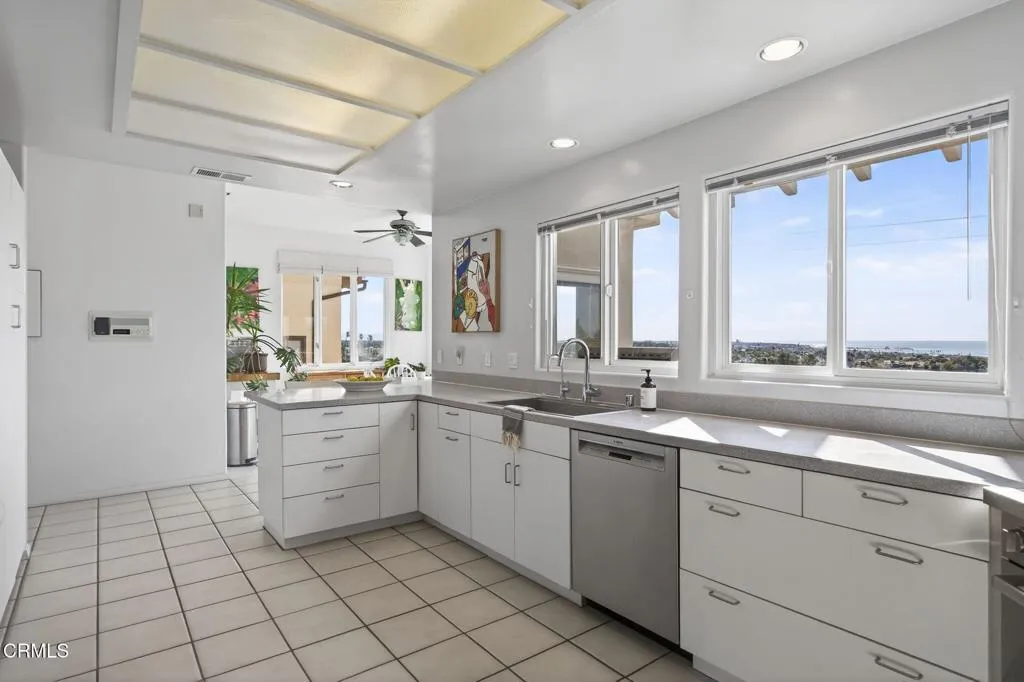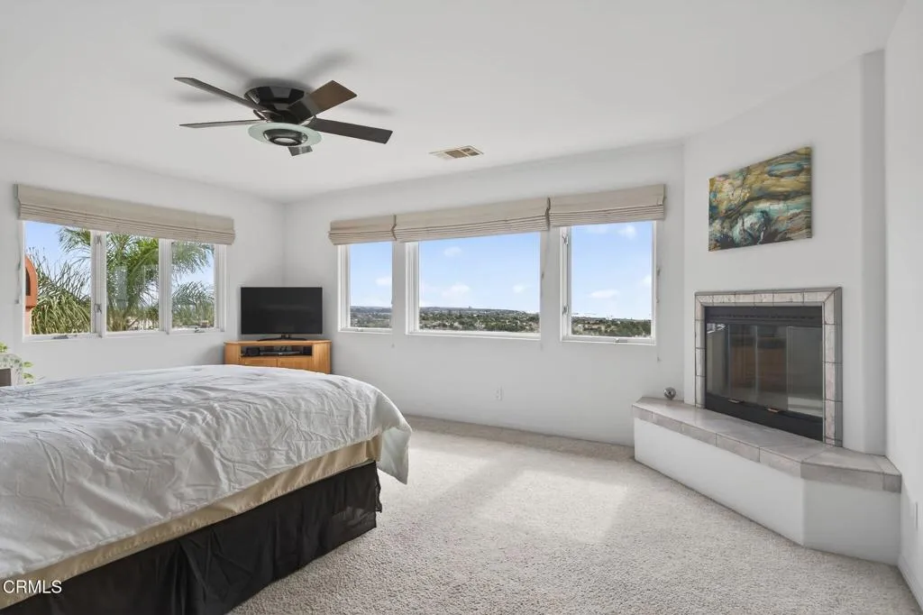 Unobstructed, south-facing ocean and island views take center stage in this Hobson Heights hillside retreat, where light, space, and coastal living come together effortlessly. This 4 bedroom, 3.5 bath home is located in one of Ventura's most sought-after hillside neighborhoods and offers a rare sense of calm and perspective, where mornings begin with soft coastal light and evenings unwind in pink sunsets over the Pacific. Designed with a modern Spanish influence, the approximately 4,100 sq ft residence is filled with natural light and oriented to embrace breathtaking views from nearly every room. The main level, easily accessible with just a single step, features ocean-view living and dining rooms with a fireplace, an open kitchen, and a balcony just off the main living spaces, perfect for morning coffee as the marine layer lifts or unwinding at sunset with the ocean stretched out before you. A bedroom and full bath on this level offer flexibility for guests, a home office, or multigenerational living. Upstairs, the private primary retreat captures sweeping views of the Pacific and Channel Islands, where you wake each morning to the horizon beyond. The spa-style bath places the soaking tub in the view, complemented by a fireplace and walk-in closet. On the lower level, two additional bedrooms, both with French doors, open to an expansive 1,000+ sq ft view deck, along with a spacious family room with bar, creating seamless indoor-outdoor living ideal for entertaining or relaxing. The 7,884 sq ft lot offers citrus trees, terraced landscaping, and a sense of privacy that is increasingly rare. Additional highlights include a 3 car garage, hardwired ethernet, smart home features, advanced security, and a 750 gallon rainwater system. Located in desirable Hobson Heights, known for its architectural charm, strong sense of community, and iconic hillside setting, this is one of Ventura's most coveted view neighborhoods, prized for its combination of character, location, and sweeping coastal vistas. The home is near beaches, C Street surf, downtown Ventura, Midtown shops and cafes, parks, schools, and the Ventura Hillside Preserve. The gentle chime of nearby church bells adds to the rhythm of daily life. This home was once owned by actors Rachel Ames and Barry Cahill. A rare opportunity to experience elevated coastal living.