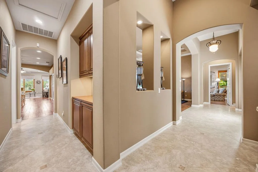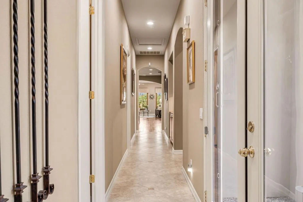 Experience elevated desert living in the exclusive Legacy enclave of Mission Hills Country Club. This beautifully spacious 3,106 square foot home offers an exceptional 3-bedroom, 4-bathroom floor plan with all bedrooms ensuite, there is great room, wet bar with wine refrigerator, plus a stylish powder room for guests--blending privacy with effortless entertaining. A private gated courtyard entry is accented by a brick driveway and walkway leading to the iron gate, creating a striking and welcoming first impression. As you enter, you are greeted by rich hickory wood flooring that runs throughout the home, creating a seamless sense of warmth and sophistication across the living and dining areas. The great room is a showstopper, featuring a fireplace flanked by custom built-ins, while custom window coverings and shutters throughout the entire home provide elegance, privacy, and light control. The kitchen is thoughtfully appointed with stainless steel appliances, including recently replaced double ovens and dishwasher, designed for both everyday ease and entertaining with style.The primary suite is a true retreat, offering a private sitting area, direct access to the pool and spa, dual walk-in closets with custom built-ins, and a luxurious bath with dual sinks, a soaking tub, and a walk-in shower--perfect for relaxation and everyday convenience.Step outside to your own private resort--featuring a recently renovated pool and spa, extended covered patio, and a built-in BBQ--all framed by lush, mature landscaping. Enjoy serene mountain and greenbelt views, creating a tranquil backdrop for both relaxation and entertaining under the desert sky. This home is as efficient as it is beautiful, showcasing an expanded owned solar system (approx. 51 panels) and a tankless water heater for modern, energy-conscious living. The epoxy-finished garage, complete with a split system for climate control, along with a two-car garage plus golf cart garage, adds both comfort and functionality. Offered furnished per inventory list, this home presents a seamless move-in opportunity or ideal desert retreat.Residents enjoy access to Social and Fitness Membership amenities, completing the full-service lifestyle synonymous with this premier community. A rare opportunity to own a meticulously upgraded home where luxury, comfort, and the best of desert living come together.