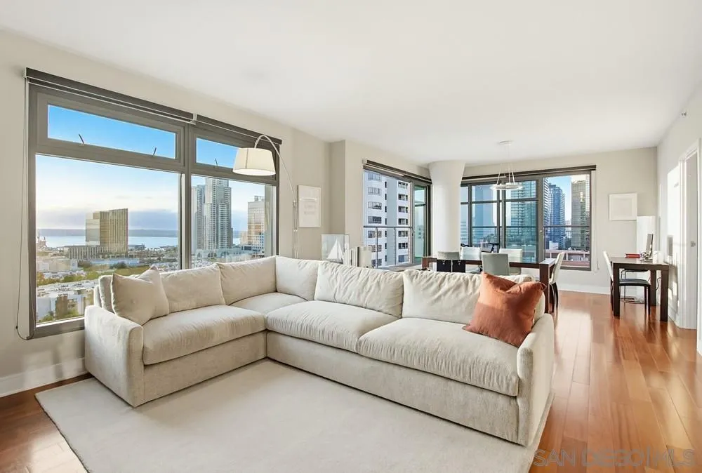 This rare southwest corner luxury home at Renaissance offers spanning views of San Diego Bay, Point Loma, and the ocean from the moment you walk in. The floor plan includes two separate bedroom suites, each with its own full bath, plus a powder room for guests. The residence has an additional room that could be set up as a home office or a additional guest sleeping area. Designed for everyday functionality, the open living and dining space connects directly to sliding sectional windows on the west and north end of the condo that brings the outdoors in, perfect for enjoying San Diego's amazing weather. Remodeled kitchen includes a waterfall styled kitchen island, designer backsplash and new stainless steel refrigerator. Spacious primary bedroom, includes large walk-in closet and ensuite bathroom. 2nd bedroom has custom built-ins includes hanging closets, dresser, several cabinets for storage and a Flat Screen TV area. MUST SEE CONDO! WEST FACING WITH SPANNING VIEWS, this Renaissance condo offers the luxury lifestyle with a fully concierge building with all the amenities, including pool, spa, fitness facility, recently remodeled community room with full kitchen, conference meeting room and new designed street front entrance and walking distance to everything, including San Diego Bay, Gas Lamp Quarter, Rady Shell Concert Venue and fine dining restaurants in the Historic Police Headquarters. This residence includes remodeled kitchen with waterfall style kitchen island with stone top, stainless steel appliances, Sectional Windows on the West & North Corner brings the outdoors in to the home. 2 Side-by-side parking spaces and storage cage.