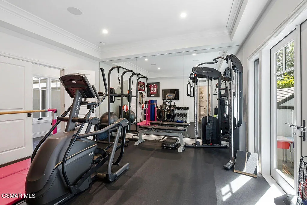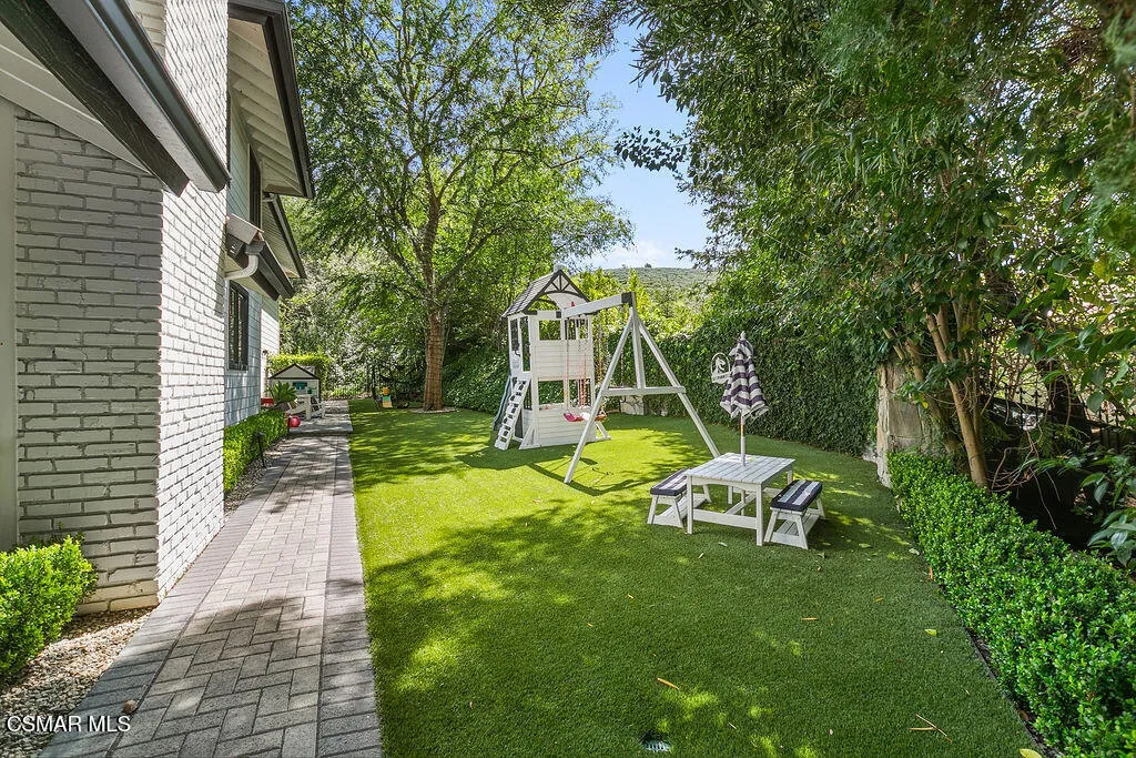 Nestled within a tranquil, tree-lined setting, this exceptional North Ranch estate welcomes you with quiet grace and timeless elegance.As you approach the private gated entrance, graceful mature trees frame the property, creating an immediate sense of serenity and privacy. Step inside through the impressive formal entry, where rich hardwood floors flow seamlessly throughout, setting a refined foundation for every room.The main level offers beautifully proportioned formal living and dining spaces, ideal for gracious entertaining. The heart of the home is a true gourmet kitchen, thoughtfully equipped with a La Cornue range, Sub-Zero refrigerator, Dacor wall oven, and convenient U-Line refrigerator drawers, all designed to inspire culinary excellence.Adjacent to the kitchen, a warm family gathering space opens to sweeping views of the private, tree-shaded backyard, where a sparkling pool and spa invite relaxation and enjoyment. Just beyond lies the grand family room, anchored by a cozy fireplace and featuring a built-in bar with a wine cooler ready for your next gathering.Down the hallway, you'll discover a spacious bedroom with its own private bath, a convenient powder room, a smartly appointed utility room, a flexible office or gym, and an impressive theater/media room perfect for unforgettable evenings.Ascending the staircase, the luxurious primary suite awaits, framed by double French doors and complete with a resort-style bathroom and a private balcony overlooking the lush grounds below. This level also includes three additional bedrooms, two more bathrooms, and a highly functional laundry room.Completing this distinguished residence is an oversized three car garage with ample storage. Meticulous landscaping envelops the entire property, enhancing the sense of seclusion and natural beauty that surrounds you.From every window whether upstairs or down the artistry of nature unfolds, offering a peaceful sanctuary to relax, entertain, and truly live.