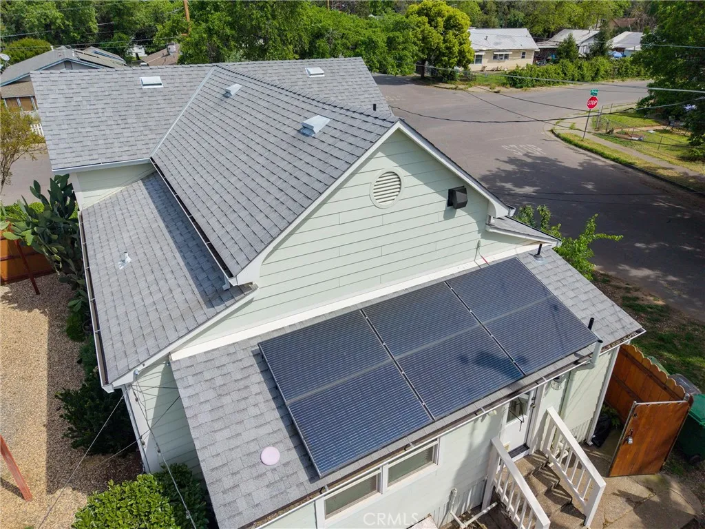 Wow! This one truly has it all. Fully updated 2 bedroom, 2 bathroom home PLUS detached art studio or office on a spacious corner lot. Features include OWNED solar system with 23 panels, updated kitchen, laminate flooring, large laundry and mud room, tall attic and cellar for storage, plus central heat and air and a newer roof. Outdoor amenities include raised garden beds, greenhouse, chicken coop, fire pit, tool shed, and a powered party shack with bar and space for entertaining. Detached studio offers built-in shelving, wall AC, and prep sink. Move-in ready with modern upgrades and versatile living spaces.