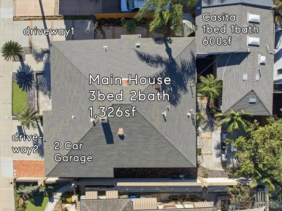 Variance granted 2-4 Units // Welcome Home to Crown Point Drive Views! First time on the market since first built, this property features a 3bed 2bath 1326sf main house, with a 600sf rear 1bed 1bath casita w/ its own driveway, full kitchen, AC/Heat, and washer dryer. Front home features include: its own driveway w/ attached 2 car garage, washer dryer in garage, central AC & Heat, lovely open high-ceiling living space with gas fireplace, and front & rear patios. Crown Point Park is directly across the street with rolling green hills and lush trees. Most owners on Crown Point Drive elect to build a 2nd/3rd story to capture the BIG east and southerly views over Mission Bay toward Fiesta Island, Bay Park, and Downtown.