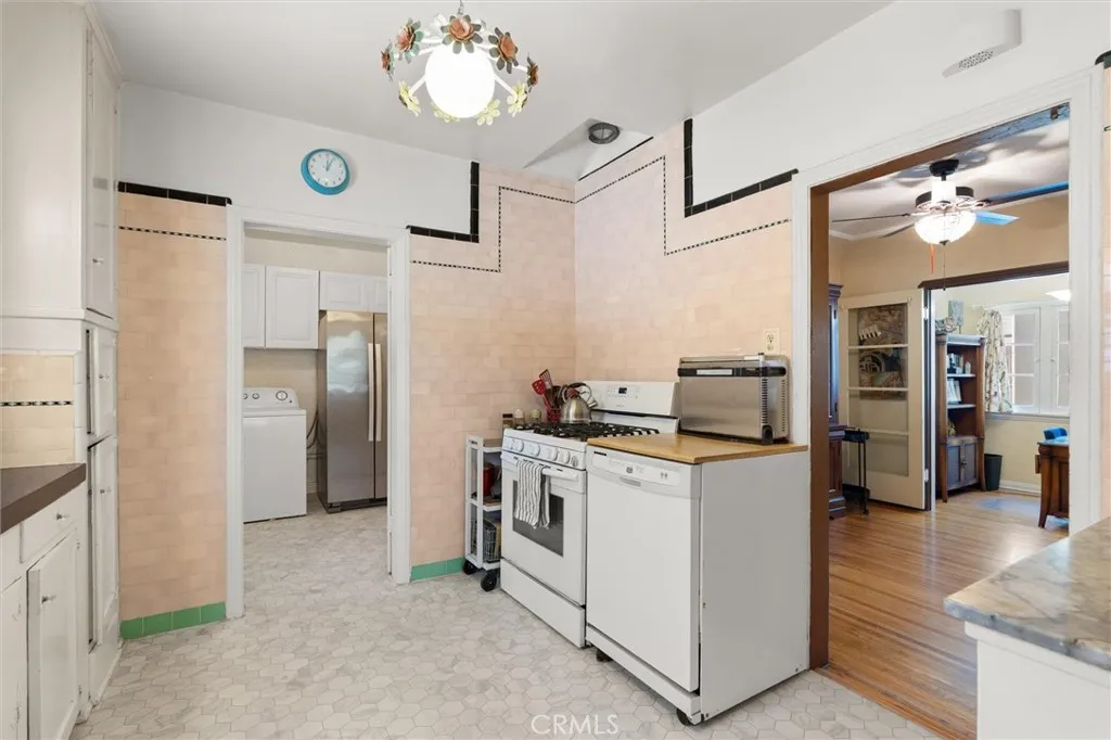 Huge 2 bed 1 bath Spanish home - over 1300 square feet! - with Art Deco features on large lot in welcoming neighborhood of North Long Beach. Large living room with tray ceilings and original Art Deco sconces frame the large front picture window and handsome wood framed windows in this expansive room. Gorgeous hardwood floors with dark wood inlays and Spanish tiles on step up to dining area bring a rich feel to this historic home. Huge bathroom features built-in vanity, full tub and separate tile shower all adorned in original tiles and vintage sink, tub, and toilet. Light and bright separate dining room off kitchen can easily function as a 3rd bedroom or nursery, plus you still have another room to function as an office or another bedroom! Nice sized bedrooms both feature spacious closets and artistic raised plaster "wedding cake" decorations on the walls and ceilings. This home is a true vintage gem! The back yard is so big that it has a large patio area perfect for entertaining and still has a large grassy area for pets, kids, and gardening. Off street parking for 2-3 cars in driveway plus a 2 car garage! This house is lovely just the way it is and also has tons of potential to add on with 2nd bathroom or explore converting garage to ADU!