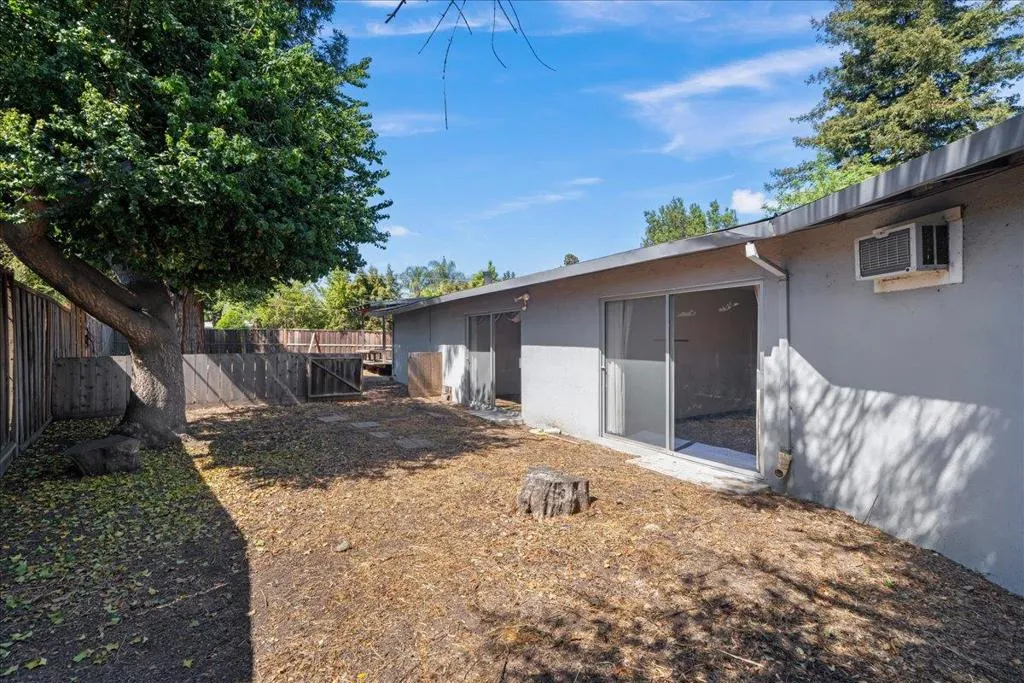 Situated on an expansive 0.36-acre lot in a desirable Saratoga neighborhood, this single-level home offers over 2,300 sq ft of living space with a spacious and distinctive layout. The interior features large living areas, including an oversized living room and a separate family room with direct backyard access through multiple sliding doors. Vaulted ceilings with exposed beams, extensive built-in cabinetry, and a unique curved bar create strong architectural character. The kitchen is generously sized with an island, abundant cabinetry, and original finishes, opening to adjacent dining and living spaces. A separate room currently used as an office functions as a third bedroom. Bedrooms are well-proportioned, and the layout provides separation between living and private spaces. The backyard is deep and usable with mature trees, a large deck, a detached outbuilding, and open space. The front courtyard offers a private entry and additional outdoor living area. Whether refreshing existing surfaces or building a custom dream home, the lot and setting provide an exceptional opportunity. Conveniently located near top-rated schools, shopping, and commute routes, this property offers scale, character, and a rare lot size in Saratoga.