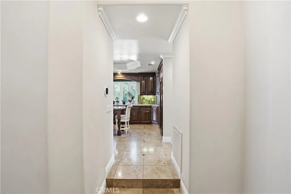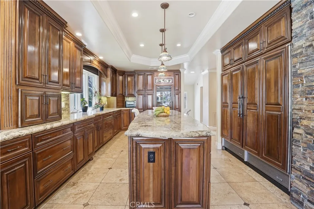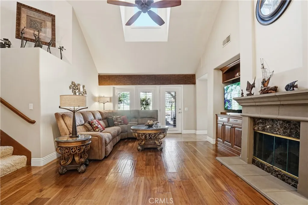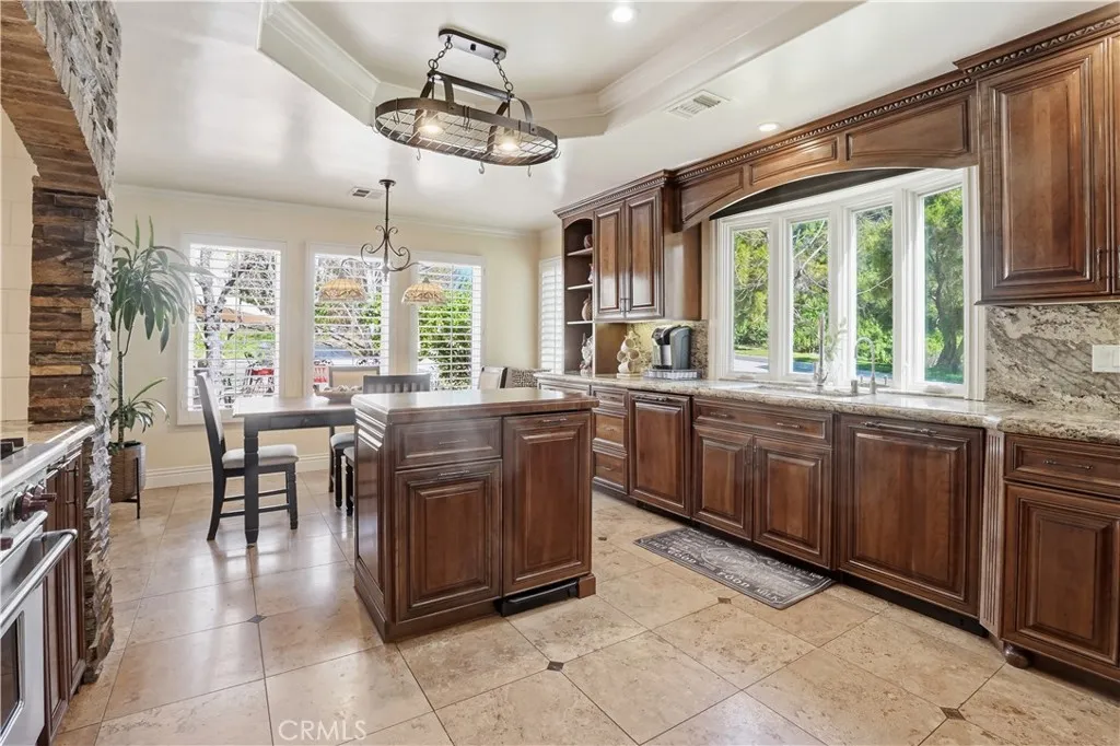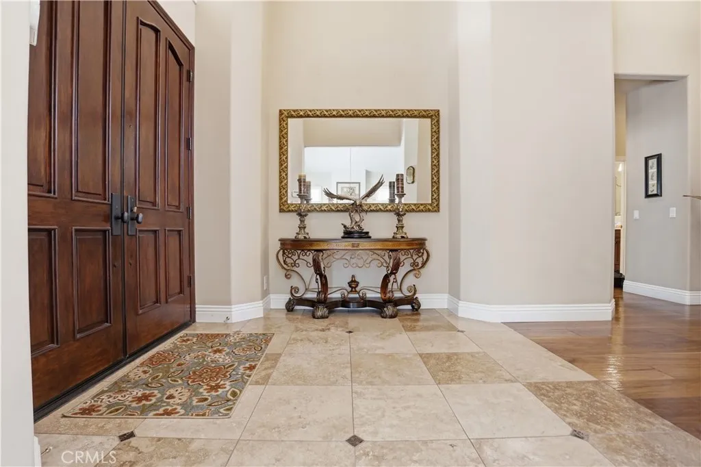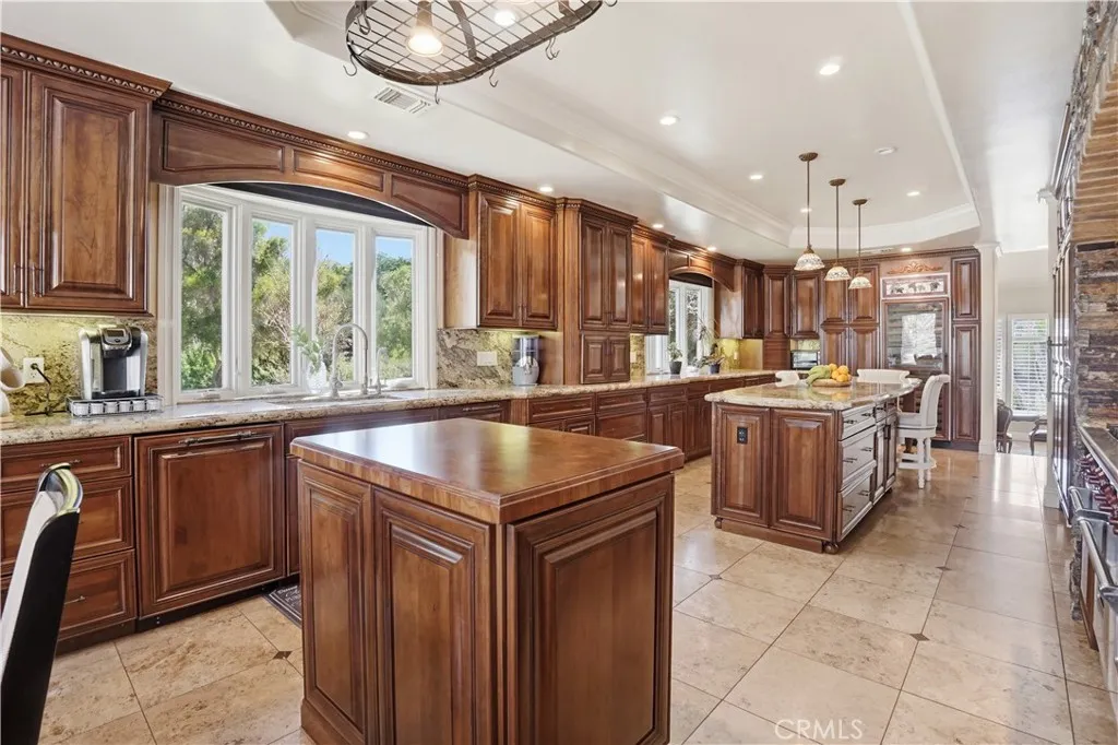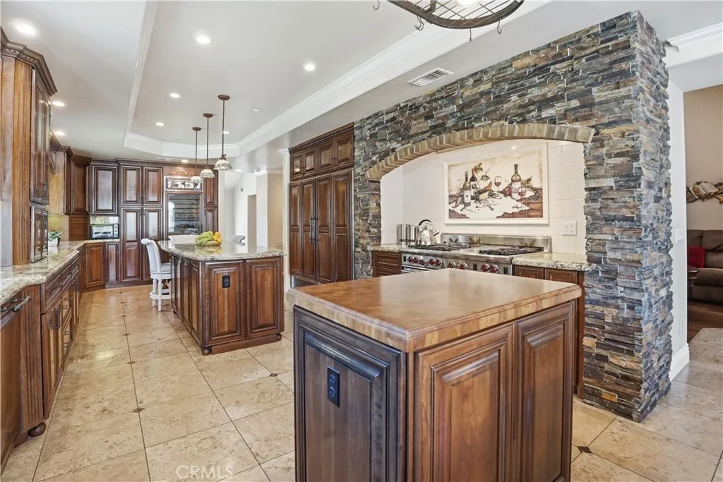 Set within the highly sought-after Sand Canyon Country Club community, this extraordinary estate delivers a rare blend of privacy, energy independence, and resort-style living on nearly one full acre (.92 acres) of beautifully usable land framed by sweeping mountain and canyon views. From the moment you arrive, the home makes a statement with its grand arched entryway, expansive driveway, and elegant architectural presence, setting the tone for what lies within. Inside, soaring vaulted ceilings, skylights, and warm natural light create an immediate sense of openness and sophistication. Rich tile and hardwood flooring flow throughout the main living spaces, connecting a thoughtfully designed layout that balances elegance with comfort. At the heart of the home is a true chef’s kitchen, built for both everyday living and elevated entertaining. Featuring an oversized center island, 8-burner professional stove, Sub-Zero refrigerator and freezer, wine fridge, and appliances seamlessly concealed behind custom wood paneling, this space is as refined as it is functional. The residence offers multiple gathering spaces including a formal dining room, elegant living areas, and multiple fireplaces, creating a warm yet luxurious atmosphere throughout. Upstairs, a rare and impressive feature awaits—a grand library loft with custom built-in shelving, perfect for a private office, study, or creative retreat. The home is equipped with modern efficiency and peace of mind, including paid-off solar panels, 3 Tesla Powerwall batteries, a whole-house water filtration system, smart thermostat technology, and energy-conscious upgrades throughout. The primary suite offers a private escape, while additional bedrooms provide generous space for family and guests. Step outside and experience a true California resort-style backyard—an entertainer’s dream featuring a sparkling saltwater pool, expansive lounging areas, and a serene oasis-like setting designed for relaxation and gatherings under the sun and stars. Additional highlights include a 3-car garage, spacious driveway, and a highly functional floor plan designed for luxury living at scale.