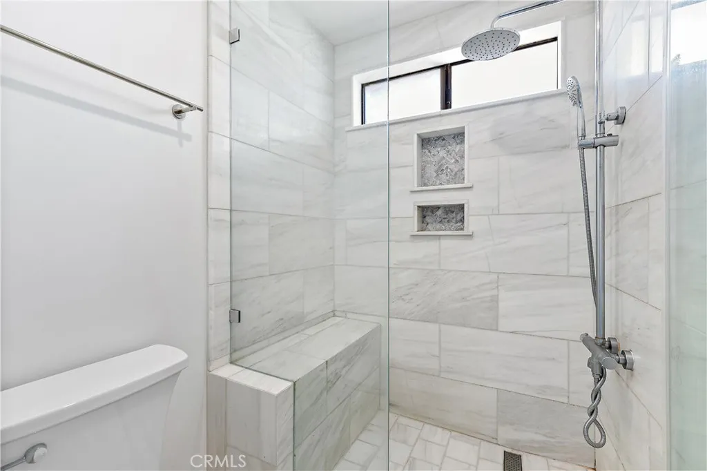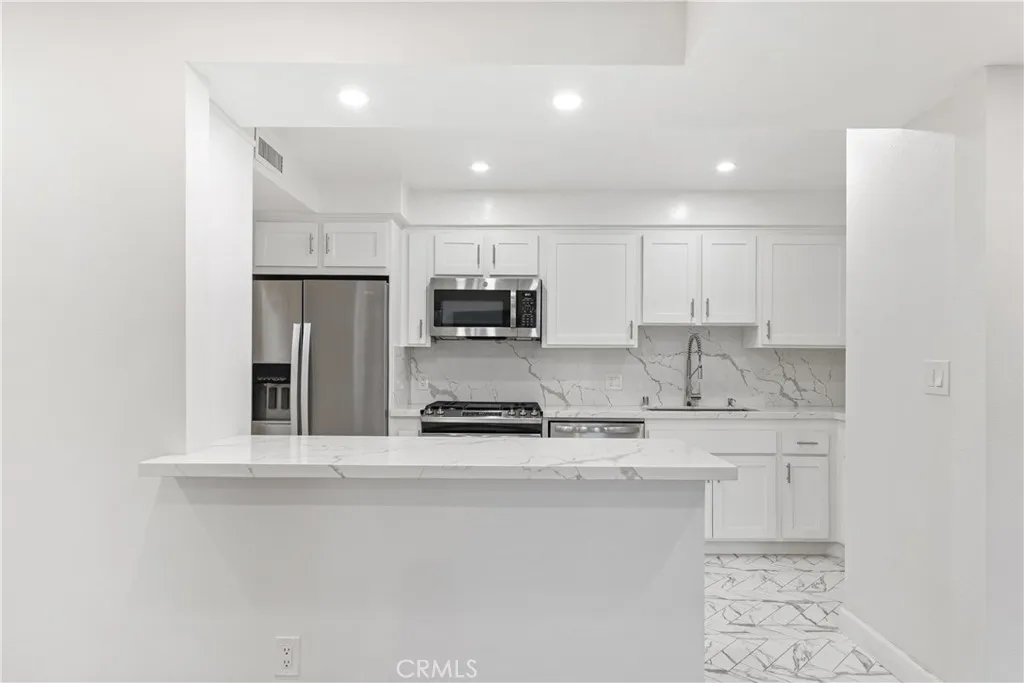 Beautifully updated single level condo in the heart of Sherman Oaks. Property features 2 bedrooms and 2 bathrooms with modern finishes throughout. Every inch of living space has been remodeled, including the kitchen, with marble flooring, quartz countertops, white cabinetry, stainless steel appliances, including a beverage center and dry bar area. Additional modern finishes include chic lighting fixtures, recessed LED lighting, modern baseboards and interior doors. Both bathrooms have been completely updated as well. The primary bathroom includes white cabinetry with quartz countertops and dual sinks. The primary shower features large format marble tile and frameless glass shower doors. The guest bathroom has also been treated to a new grey vanity with quartz countertop, LED mirror, and marble flooring. The guest bathroom also features a soaking tub/shower combination with white subway tile and a modern frameless shower door. Additional property upgrades include laminate flooring, a brand new HVAC system, and a brand new, in unit stacked washer and dryer. Abundant natural light flows through dual sliding glass doors, and dining area skylight further enhances the open and inviting layout. Located on the 2nd floor, this quiet end unit property also includes 2 assigned side by side subterranean parking spaces with secure gated access. The well maintained, gated community is surrounded by mature, professionally landscaped grounds and offers premium amenities including a sparkling pool, lush greenbelts, and serene park like settings. Cable, wifi, water, and trash are also included in the rent. Ideally located just minutes from Ventura Blvd, the Sherman Oaks Galleria, and easy access to the 405 and 101 freeways. This location is perfect for convenient commuting and enjoying the best Sherman Oaks has to offer.