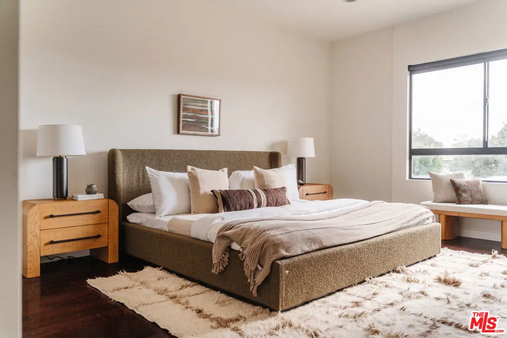 Steps from Melrose Place, this light-filled residence is one of just 6 units in an intimate, contemporary West Hollywood building. This bright two-bedroom condo offers an expansive open floor plan designed for comfortable living and easy entertaining. Walls of glass and corner windows fill the home with natural light while capturing treetop and Hollywood Hills views. Sliding doors open to a private balcony off the main living space, creating seamless indoor-outdoor flow. While open in layout, the living spaces feel thoughtfully defined, with a cozy living room centered around a fireplace, a generous dining area, and a high-end Italian kitchen with a large center island that naturally becomes the heart of the home and an ideal space for gathering and entertaining. The spacious primary suite features its own fireplace, a custom walk-in closet, and a large bath with dual vanities, glass-enclosed shower, and separate soaking tub. The guest bedroom is well sized, offering two closets and an en-suite bath, ideal for guests, family, or a home office. Additional highlights include a powder room, separate laundry room with side-by-side washer and dryer, and gated parking with two assigned spaces plus guest parking. Ideally located near West Hollywood's best dining, shopping, nightlife, and the beloved Sunday Melrose Place Farmers Market, this residence offers style and exceptional livability in one of L.A.'s most desirable neighborhoods.
