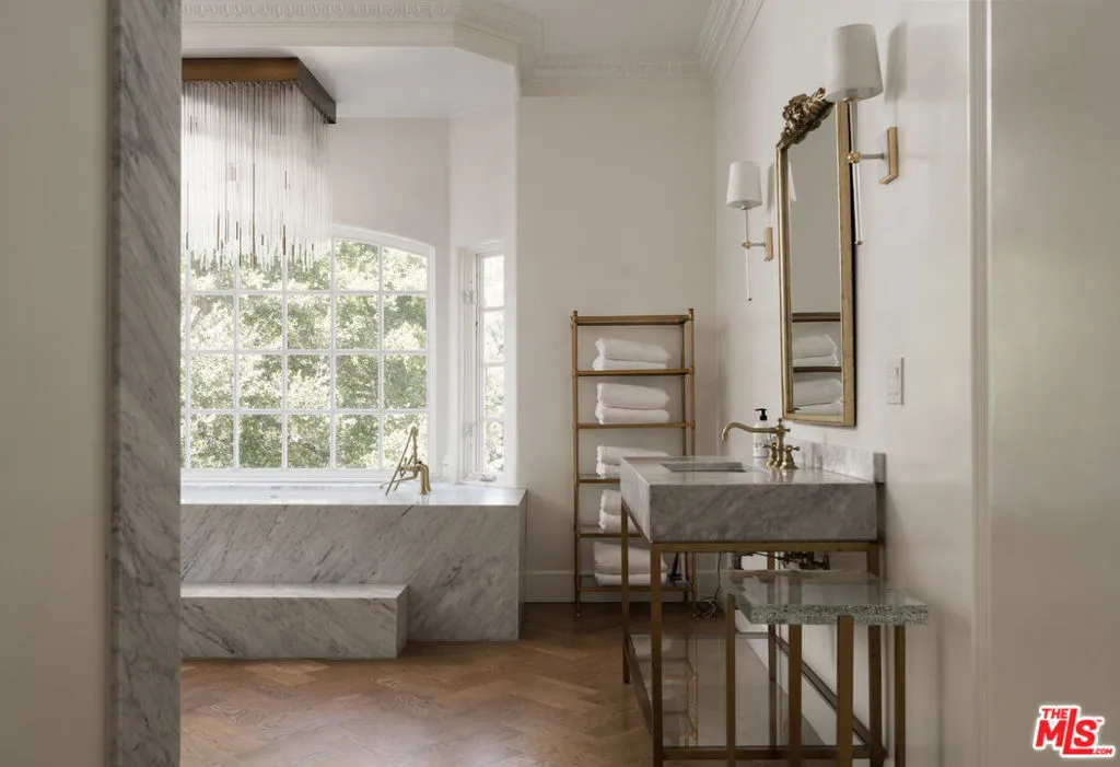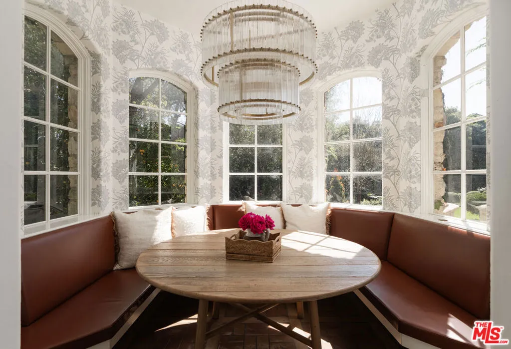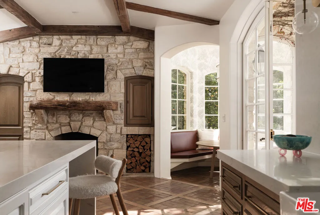 Moments from Montecito's Upper Village, return to your own private fairytale estate. Tucked along a charming lane in a coveted location, the property offers the rare balance of convenience and seclusion. The residence is defined by a stone exterior, slate rooflines, soaring cathedral ceilings, custom millwork, and multiple romantic fireplaces. In the kitchen, hand-hewn beams reclaimed from a 300-year-old European barn bring warmth and quiet character. 5 bedroom suites are thoughtfully arranged on a single level, while a top-floor media lounge with full kitchen & bath creates an ideal retreat for guests or relaxed entertaining. Across 1.49 gated acres, the grounds feature mature elm trees, lawns, converted barn, & a bocce court, along with approved plans for a future pool & cabana.