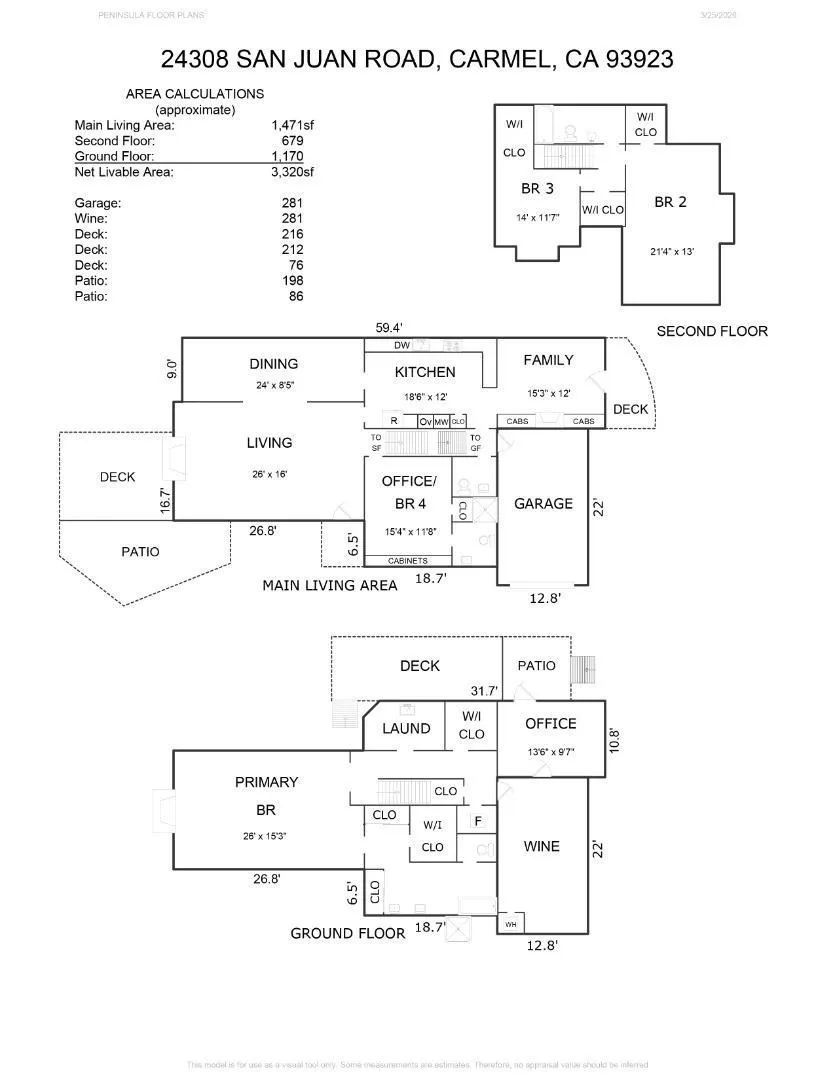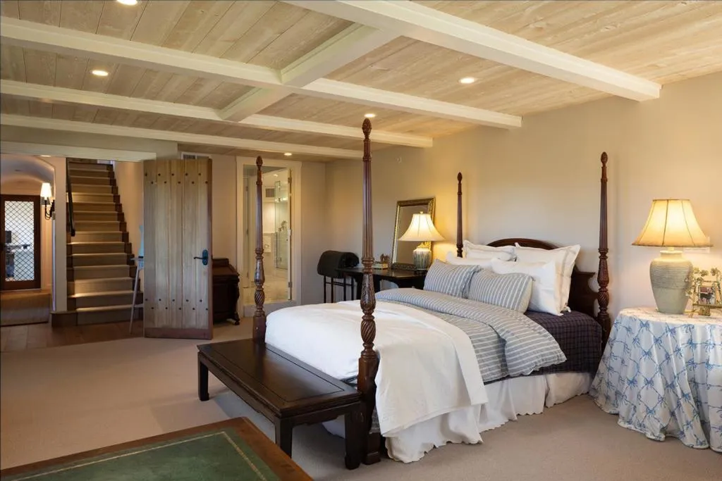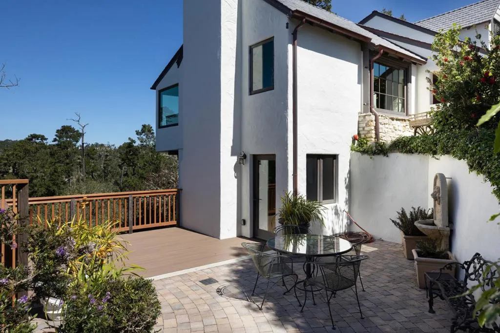 Tucked away in a peaceful pocket of Carmel Woods, this beautifully updated home sits above the forest canopy, offering expansive vistas and glimpses of the ocean from select rooms. Three newly built decks surround the home, providing multiple outdoor spaces to enjoy the forest views. Inside, the main level features a spacious living room with soaring open-beam ceilings, a fireplace, and rich hardwood floors that extend throughout. The dining area is lined with windows, inviting in natural light and ocean views. The well-appointed kitchen with marble countertops flows into a family room with its own fireplace and direct deck access. A versatile library with built-in shelving sits adjacent to a full bath, with flexibility to serve as a fourth bedroom or guest suite. Upstairs, two bedrooms with vaulted ceilings share a full bath. On the lower level, the expansive primary suite provides a private retreat with a fireplace, private patio, and a large bathroom featuring both a soaking tub and separate shower. Additional spaces include a dedicated office and a stone wine grotto. Located just minutes from downtown Carmel and the beach, this charming forest hideaway enjoys a quiet setting.