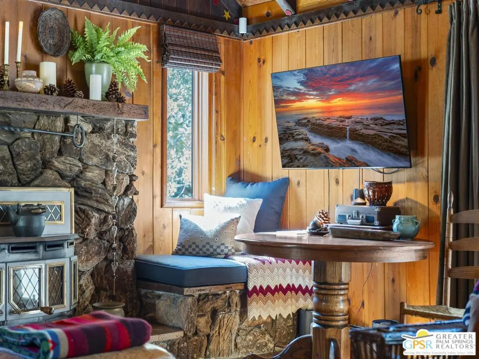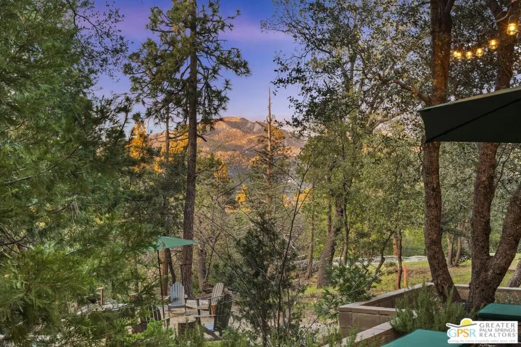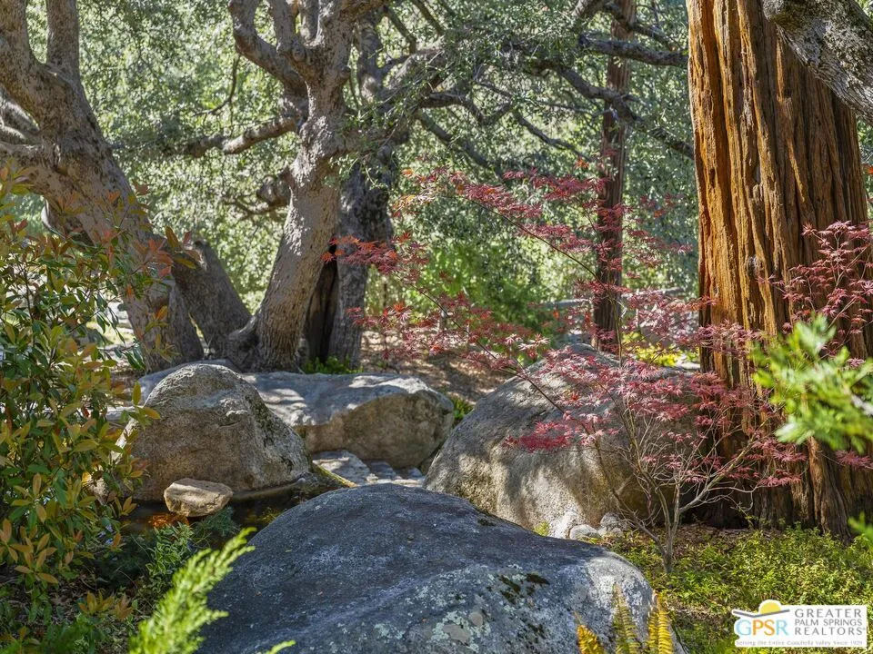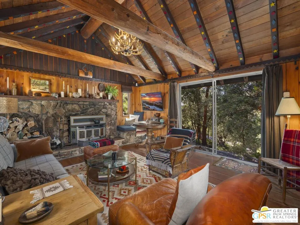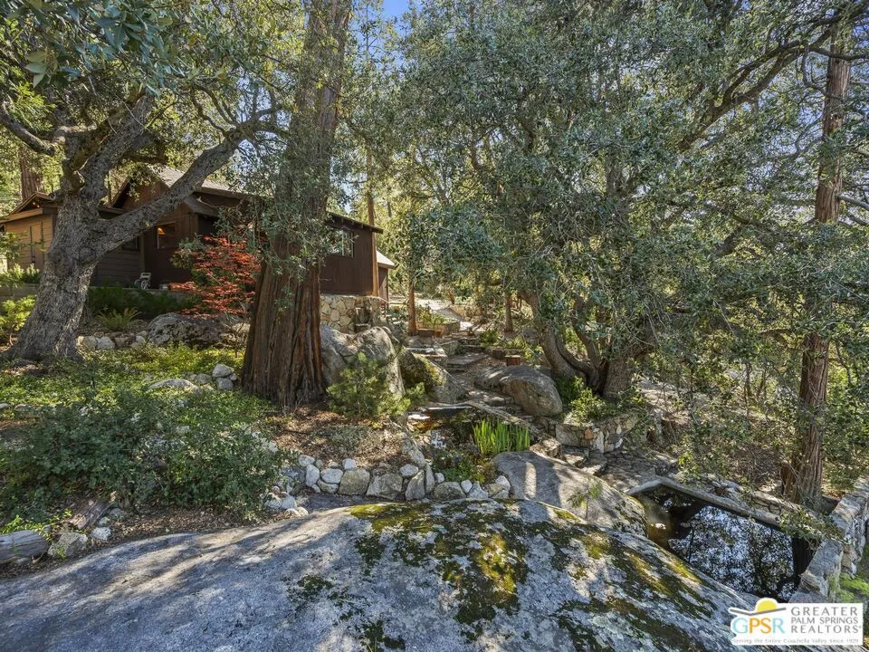 Down a quiet mountain road, a private drive winds through the trees to this cabin built in 1945, set on 0.41 acres and tucked into the hillside, a place that feels easy to settle into and hard to leave. This 1-bedroom, 1-bath retreat offers approximately 1,088 sq ft and reflects the kind of classic mountain cabin that is becoming harder to find. Vaulted ceilings with exposed beams and original pine paneling bring warmth, texture, and a true sense of character. Thoughtfully maintained and curated, its original charm remains intact. Entry begins in a mudroom with heated flooring, offering a comfortable transition inside. Straight ahead, the full bath features a clawfoot tub. To the left, the kitchen opens into a spacious eat-in area with a central dining space, wood cabinetry, tile counters, and natural light. Just beyond the kitchen, the living room opens under vaulted ceilings with a beautiful stone fireplace and wood-burning stove insert as its focal point. Playful, colorful accents highlight the wood-beamed ceilings, giving the space a distinct personality. It is the kind of room that invites you to sit down and stay awhile, where quiet mornings, evenings by the fire, and time spent together naturally turn into lasting memories. Off the right side of the kitchen, the bedroom is tucked into a quiet corner, with windows overlooking the surrounding grounds. At night, open the windows and take in the gentle sound of water and frogs in the distance. From the mudroom, a rear door leads directly outside. Just beyond the cabin, a large detached two-story structure offers flexible use. Semi-finished and ready to take shape, it could serve as a studio, additional living space, or something entirely your own. The grounds unfold with stone terraces, winding paths, and multiple outdoor areas to gather or retreat. A series of cascading ponds and waterfalls move through the landscape, creating a soft, continuous rhythm of water. Lily pads and seasonal blooms add color and texture, while a drip irrigation system supports established landscaping including dogwoods, Japanese maple, manzanita, tall pines, and flowering meadows, all centered around a large, ancient oak tree that stands out as a true centerpiece of the property. Recent improvements include a newer roof, copper plumbing, upgraded electrical with a newer main panel, and central propane heating. Private, intentional, and full of character. A true mountain retreat.