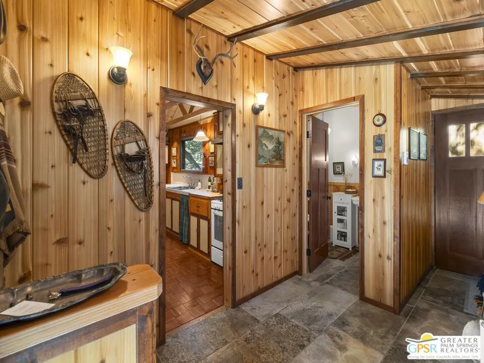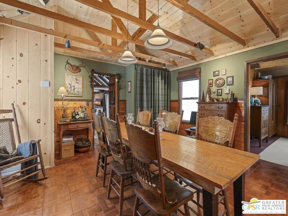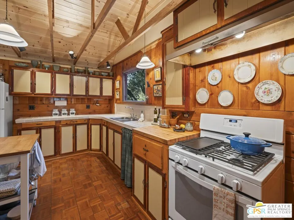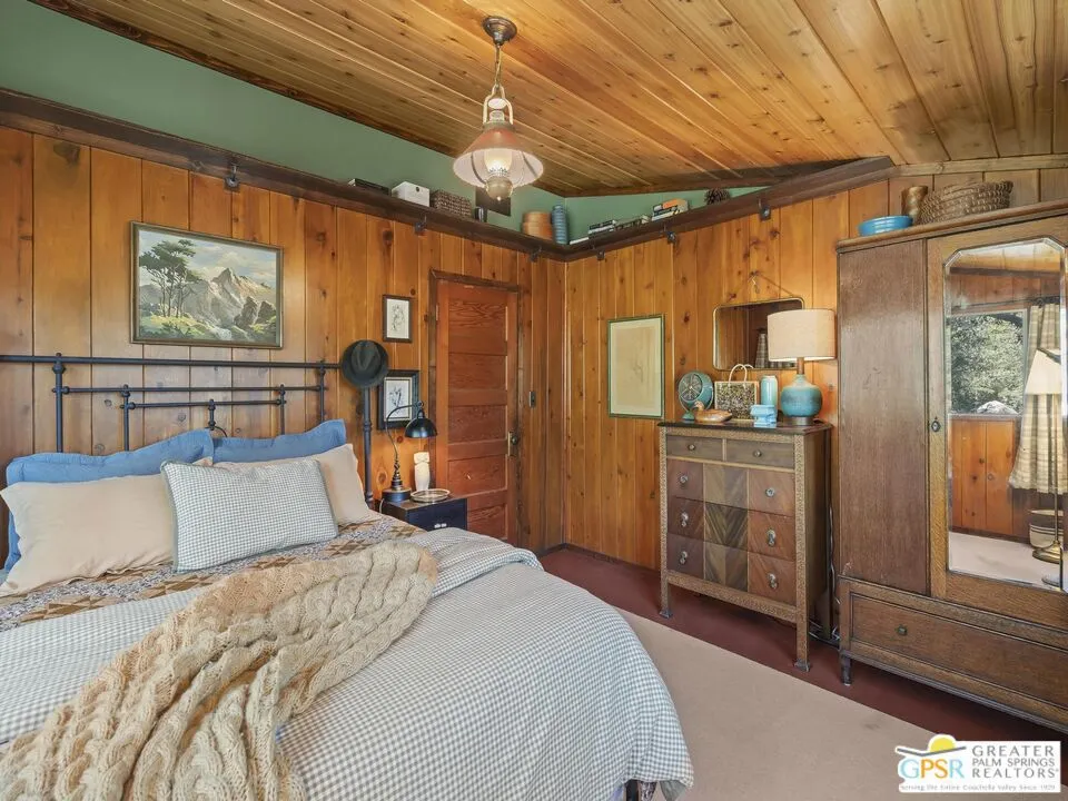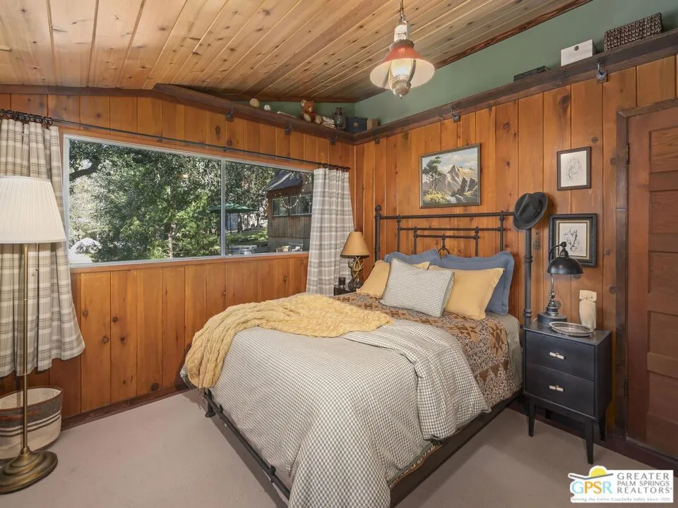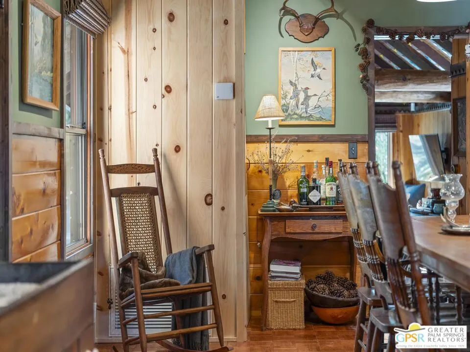 Down a quiet mountain road, a private drive winds through the trees to this cabin built in 1945, set on 0.41 acres and tucked into the hillside, a place that feels easy to settle into and hard to leave. This 1-bedroom, 1-bath retreat offers approximately 1,088 sq ft and reflects the kind of classic mountain cabin that is becoming harder to find. Vaulted ceilings with exposed beams and original pine paneling bring warmth, texture, and a true sense of character. Thoughtfully maintained and curated, its original charm remains intact. Entry begins in a mudroom with heated flooring, offering a comfortable transition inside. Straight ahead, the full bath features a clawfoot tub. To the left, the kitchen opens into a spacious eat-in area with a central dining space, wood cabinetry, tile counters, and natural light. Just beyond the kitchen, the living room opens under vaulted ceilings with a beautiful stone fireplace and wood-burning stove insert as its focal point. Playful, colorful accents highlight the wood-beamed ceilings, giving the space a distinct personality. It is the kind of room that invites you to sit down and stay awhile, where quiet mornings, evenings by the fire, and time spent together naturally turn into lasting memories. Off the right side of the kitchen, the bedroom is tucked into a quiet corner, with windows overlooking the surrounding grounds. At night, open the windows and take in the gentle sound of water and frogs in the distance. From the mudroom, a rear door leads directly outside. Just beyond the cabin, a large detached two-story structure offers flexible use. Semi-finished and ready to take shape, it could serve as a studio, additional living space, or something entirely your own. The grounds unfold with stone terraces, winding paths, and multiple outdoor areas to gather or retreat. A series of cascading ponds and waterfalls move through the landscape, creating a soft, continuous rhythm of water. Lily pads and seasonal blooms add color and texture, while a drip irrigation system supports established landscaping including dogwoods, Japanese maple, manzanita, tall pines, and flowering meadows, all centered around a large, ancient oak tree that stands out as a true centerpiece of the property. Recent improvements include a newer roof, copper plumbing, upgraded electrical with a newer main panel, and central propane heating. Private, intentional, and full of character. A true mountain retreat.