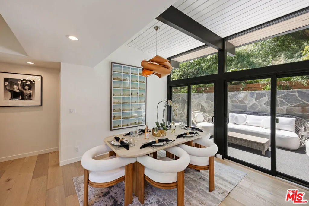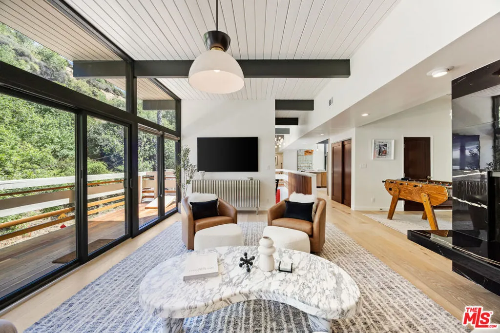 There are houses you admire. And then, there are houses that change how you live. This is the latter. Perched at the top of a secluded cul-de-sac in the Sherman Oaks Hills, this three-bedroom, three-bath mid-century architectural is the rare home that makes the city feel optional. Touted as an "excellent example of Mid-Century Modern post-and-beam residential architecture" by LA Planning, the bones are pure California: clean lines, flat roofline, soaring beamed ceilings, wood slat details. But it's the way the inside and outside simply become one space that stops you cold. A floating staircase welcomes you into a dynamic living room where floor-to-ceiling glass slides open and suddenly there's no difference between the dining room and the canyon. Between the living room and the evening sky. The outdoor spaces are designed for the life, not just the listing. An 8-person salt water hot tub glows against a natural stone wall. A covered lounge area sits just steps from a sleek, updated kitchen. A calming fountain sets the tone. At night, with the canyon green and the sky going pink, this backyard feels like the best hotel you've ever stayed in except it's yours. Inside: completely reimagined. The kind of renovation that respects the architecture while making it feel completely current. The primary suite opens to a private redwood deck with tranquil hillside views. A two-car garage and versatile bonus room elevate the home's appeal. The kind of house that design people notice immediately. Sherman Oaks gives you all of this and Ventura Boulevard in five minutes. The quiet of the canyon without the compromise of the commute. This is what it feels like to finally be somewhere that fits.