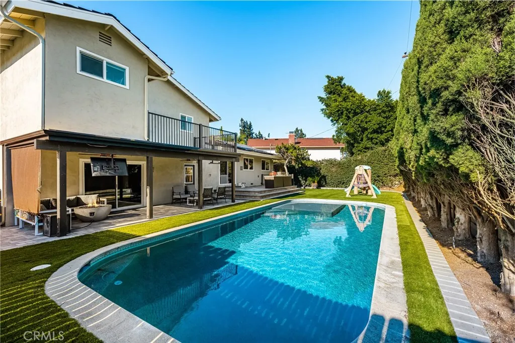 Welcome to a fully reimagined residence where refined design meets effortless indoor-outdoor living. This beautifully remodeled 4-bedroom, 3-bath home offers a seamless open-concept layout, anchored by a chef-inspired kitchen featuring a 48-inch range, quartz countertops, stainless steel appliances, and a spacious flow into the main living areas—ideal for both everyday living and elevated entertaining. Thoughtfully upgraded throughout, the home showcases luxury vinyl wood flooring, a custom-built bar with a full-size wine refrigerator, and tastefully remodeled bathrooms that reflect a clean, modern aesthetic. Each bedroom is enhanced with custom closet systems, while the primary suite offers a true retreat with dual walk-in closets designed for both function and style. Step outside into your private resort-style backyard, complete with a Pebble Tec pool and baja shelf, a heat pump for year-round enjoyment, and a custom dual charcoal and gas barbecue. Expansive paver patios, artificial turf, and multiple outdoor living spaces—including a balcony and covered patio—create a seamless extension of the home’s interior. Designed with efficiency and longevity in mind, this property includes fully paid solar panels, a solar battery system, EV charging, and a newly installed HVAC and heating system. A spacious storage shed adds additional functionality. Located in a highly desirable neighborhood with award-winning schools, this home delivers a rare combination of modern upgrades, energy efficiency, and true California indoor-outdoor living.
