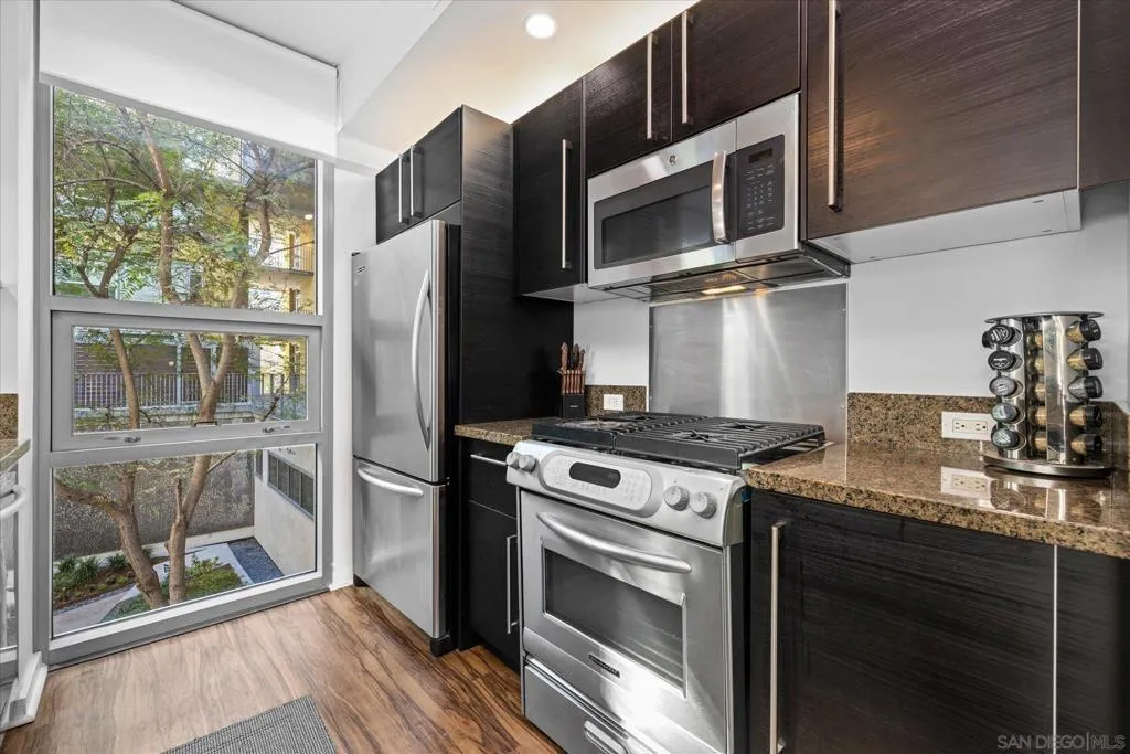 Get ready to upgrade your lifestyle here at the ICON high rise located in the heart of downtown San Diego. Having a walk score of 98/100, everything from restaurants, coffee shops, bars, shopping, grocery stores and of course Petco Park are all just a few steps away. Welcome to one of the largest one-bedroom, plus office space, floors plans in East Village, this SE corner residence gets an abundance of natural light and has lovely tree top views. This is one of the quietest units in all of downtown located on the inner sanctuary courtyard with eye catching sculptors and a radiating wall of glistening reflective wind elements to enhance your views. There is a separate area for a home office and an extra half bath for your guests. Bedroom en-suite has dual vanities and a walk-in closet. The expansive floor plan is flooded with natural light, thanks to the floor-to-ceiling windows that highlight the beauty of the courtyard. Enjoy a peaceful and private ambiance, with a thoughtful design that maximizes comfort and style. Ideal for those who appreciate a tranquil setting with easy access to city living, this condo truly feels like a sanctuary. Continued in supplement below... ICON has the best condo rooftop in all of downtown San Diego, named the ICON Skybox. This roof top has the most amazing views of the bay and downtown skyline. This amazing terrace has lots of seating, BBQs, a large screen TV and heaters. There is even a tiered seating section looking directly into Petco Park to watch baseball games and other events such as concerts etc. Other amenities include a large Fitness Center, Community Lounge with full kitchen, business center, TV, and workspace, Movie Theater, shared EV charger, 24/7 front desk staff and an onsite property manager. Don’t miss the opportunity to make this peaceful oasis your own!