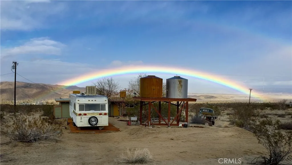 South side acreage & view property near Joshua Tree National Park! Affectionately known as "Twin Tanks" for its landmark elevated pair of water cisterns (just for looks, this property offers municipal water--already hooked up!) as well as two similarly-styled homestead cabins. The cabins are set up with the east one for sleeping and eating, the west cabin offers a bathroom with a shower. Enjoy indoor / outdoor living on this charming back patio area with fire pit--perfect setup for stargazing at night or sipping coffee at daybreak while listening to the coyotes call. After breakfast, put on your hiking shoes as this generous 5-acre parcel is a quick hop to the hiking trails of Indian Cove and the Joshua Tree National Park! Currently used as a licensed short-term rental this terrific homestead cabin property is a piece of the area's storied history. Comes furnished and ready for fun--includes a vintage travel trailer (good for storage, not currently habitable) and an old truck. Come see today!