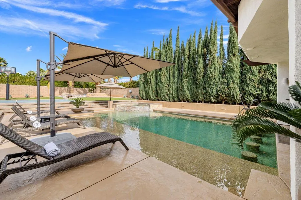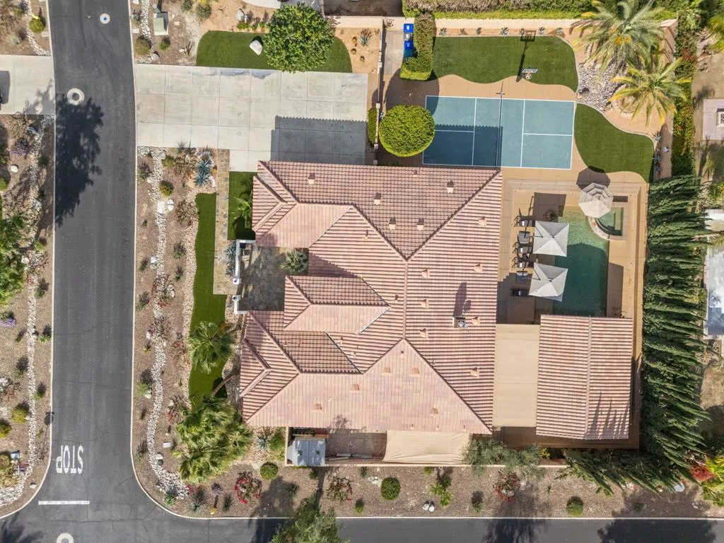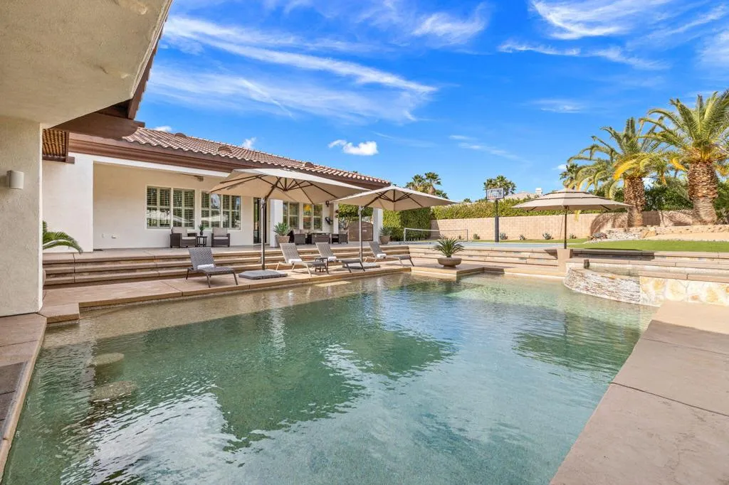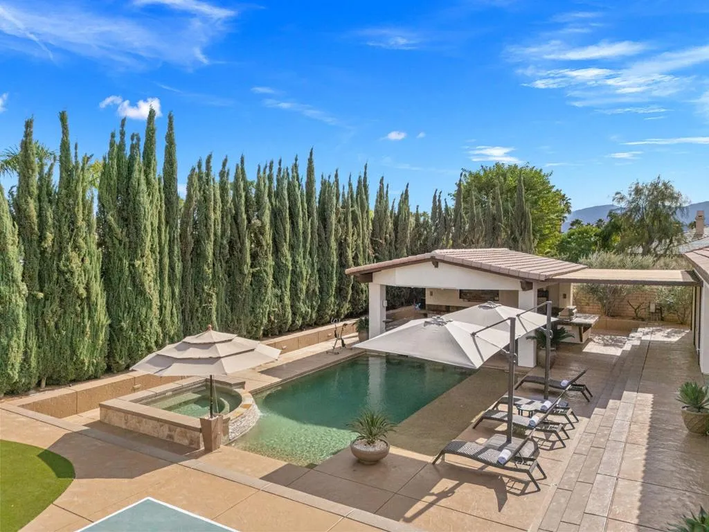 Equal to a 5-Star estate, this newly ($350k) top of the line remodel, boast numerous amenities.. Highlighted features are pickle ball court, oversized driveway, three car garage, corner location, outstanding backyard features. New tile floors throughout, and new shutters on all the windows. This 4 bedroom, + office, 3.5 bath, sold furnished home is located on a 1/2 acre parcel. Open concept living and dining. Dining and seating bar together accommodate 12 comfortably. Great room has big screen HDTV, DVD, cozy gas fireplace and comfortable furnishings. Amuse yourself with 8 seated casino style poker table with spaces for drinks, cards; to include shuffler and poker chips.Gourmet kitchen. Slate counter tops. All new Cosmo appliances. The fully equipped, gourmet kitchen has six burner gas cook-top, double ovens, microwave & dishwasher and large subzero refrigerator. Equipped with everything you need.All bedrooms and baths have clean and comfortable beds, etc. Home has 3 Queens, One Master King bed and office can accommodate twin beds, or hide-a-bed. or office furniture. TV's in all rooms.Master bedroom is on pool/spa side of the house with double slider to a large patio. The luxurious Master Suite features a King-size bed, TV. Oversized master bathroom area and oversize separate tiled shower and freestanding tub.The Outdoors Resort Style is amazing. Get ready to relax and enjoy the extra-large saltwater pool & spa, overhead waterfall, bar seats, & basketball hoop and pickle ball court/ or make it tennis. The pool also has a tanning shelf with lounge chairs that fit perfectly so you can truly kick back and enjoy your new home. Outdoor kitchen with huge built in BBQ, sink, fridge, lighting, fans and dining table with seating for 8. The other large covered outdoor patio area off the great room also has a dining table with seating for 8. Behind the outdoor kitchen are two convenient outdoor separate bathrooms, one for men and one for women as well as an outdoor shower. Super nice.Other Amenities: High-speed wireless internet, Cable TV available. fully-equipped laundry room with washer & dryer, ironing board & iron. Oversized driveway for 6 cars plus 3 car garage. Doesn't get any better..Come see this beauty...