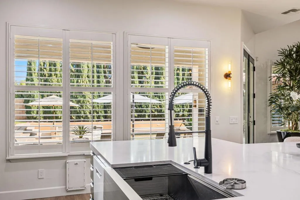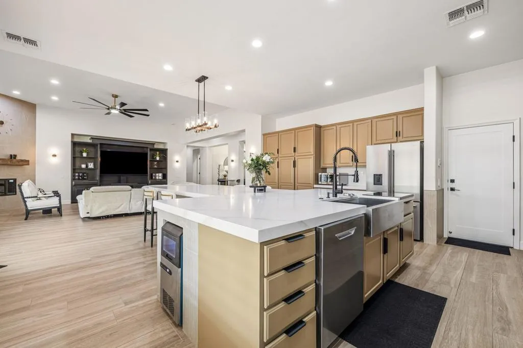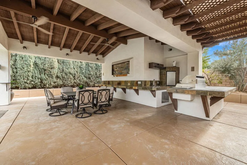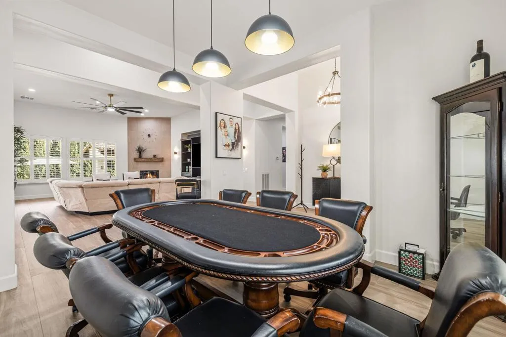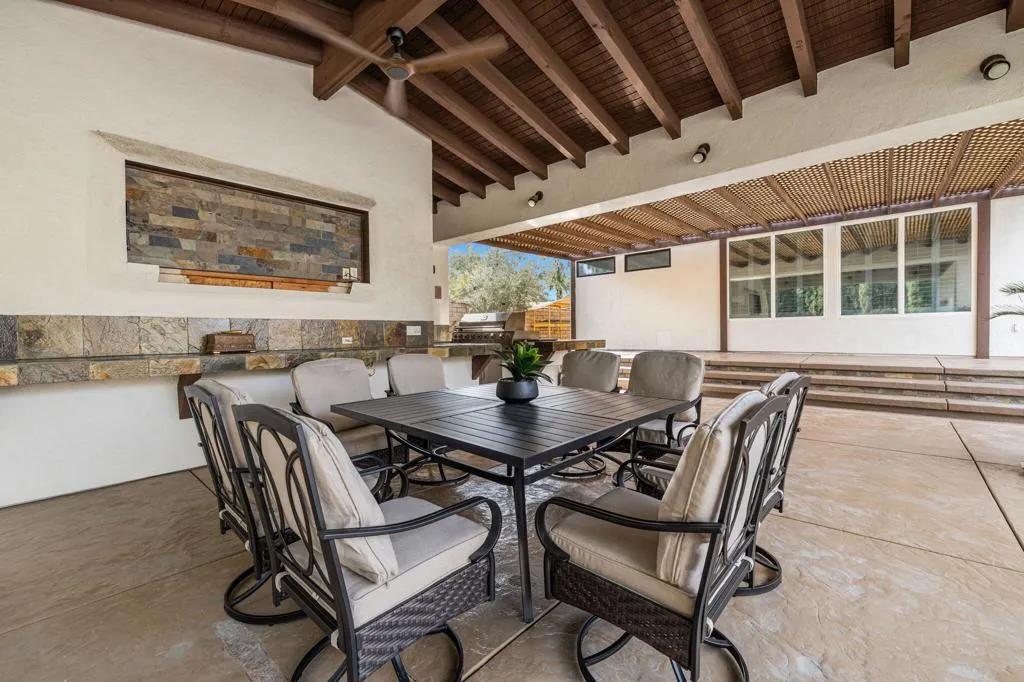 Equal to a 5-Star estate, this newly ($350k) top of the line remodel, boast numerous amenities.. Highlighted features are pickle ball court, oversized driveway, three car garage, corner location, outstanding backyard features. New tile floors throughout, and new shutters on all the windows. This 4 bedroom, + office, 3.5 bath, sold furnished home is located on a 1/2 acre parcel. Open concept living and dining. Dining and seating bar together accommodate 12 comfortably. Great room has big screen HDTV, DVD, cozy gas fireplace and comfortable furnishings. Amuse yourself with 8 seated casino style poker table with spaces for drinks, cards; to include shuffler and poker chips.Gourmet kitchen. Slate counter tops. All new Cosmo appliances. The fully equipped, gourmet kitchen has six burner gas cook-top, double ovens, microwave & dishwasher and large subzero refrigerator. Equipped with everything you need.All bedrooms and baths have clean and comfortable beds, etc. Home has 3 Queens, One Master King bed and office can accommodate twin beds, or hide-a-bed. or office furniture. TV's in all rooms.Master bedroom is on pool/spa side of the house with double slider to a large patio. The luxurious Master Suite features a King-size bed, TV. Oversized master bathroom area and oversize separate tiled shower and freestanding tub.The Outdoors Resort Style is amazing. Get ready to relax and enjoy the extra-large saltwater pool & spa, overhead waterfall, bar seats, & basketball hoop and pickle ball court/ or make it tennis. The pool also has a tanning shelf with lounge chairs that fit perfectly so you can truly kick back and enjoy your new home. Outdoor kitchen with huge built in BBQ, sink, fridge, lighting, fans and dining table with seating for 8. The other large covered outdoor patio area off the great room also has a dining table with seating for 8. Behind the outdoor kitchen are two convenient outdoor separate bathrooms, one for men and one for women as well as an outdoor shower. Super nice.Other Amenities: High-speed wireless internet, Cable TV available. fully-equipped laundry room with washer & dryer, ironing board & iron. Oversized driveway for 6 cars plus 3 car garage. Doesn't get any better..Come see this beauty...