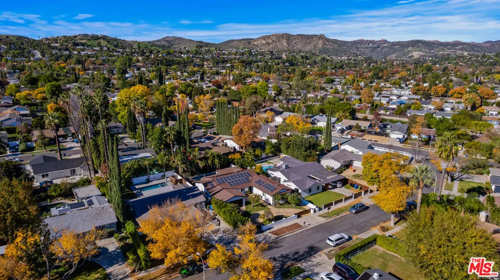 Beautifully updated Woodland Hills single story with modern upgrades, smart features, and a resort style backyard. This four bedroom three bath home blends comfort, style, and functionality in a quiet residential setting. Step inside to an open and inviting layout with a central family room that flows seamlessly into the brand new chef's kitchen complete with new cabinetry, countertops, and appliances. The dining room has also been fully redone and provides the perfect setting for hosting family and friends. Fresh paint throughout the interior and exterior, new flooring in all bedrooms, and updated lighting give the home a clean, modern feel. The home offers a desirable split floor plan. On the north side of the property, there is a private one-bedroom suite with its own bathroom, ideal for teenagers, guests, in-laws, or extended family. It can also be easily converted into an ADU, as a separate electrical panel and dedicated sewer line are already in place. On the opposite side of the home, you will find the remaining bedrooms and baths, including the spacious primary suite with a walk in closet and a newly renovated ensuite bathroom. The backyard is a true standout with an automated salt water pool and raised spa, and smart controls equipment. A heated pergola with built in lighting, audio, and video creates a resort style outdoor living experience. The property also includes a gated drive through driveway with stamped concrete, enclosed carport, and multiple fruit and shade trees. Additional improvements include OWNED solar, automated light switches, a whole house fan, fiber internet, and smart home touches throughout. Close to the Calabasas Commons, Westfield Topanga, hiking trails, and a short drive to the beaches, this home offers comfort, convenience, and tremendous value. Turnkey, upgraded, and full of potential. A must see.