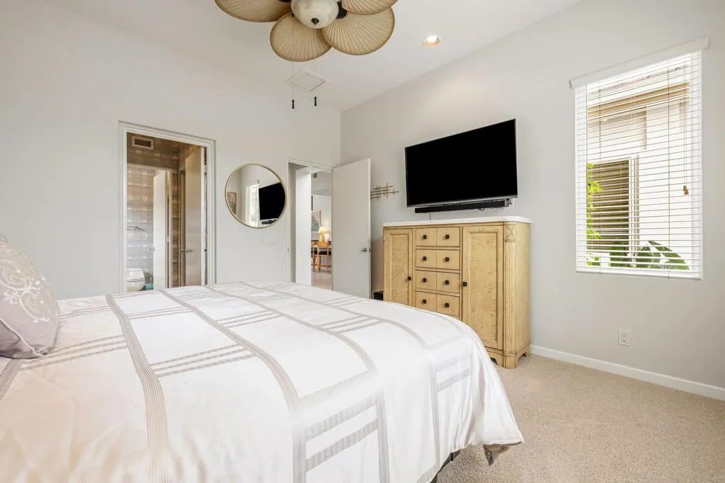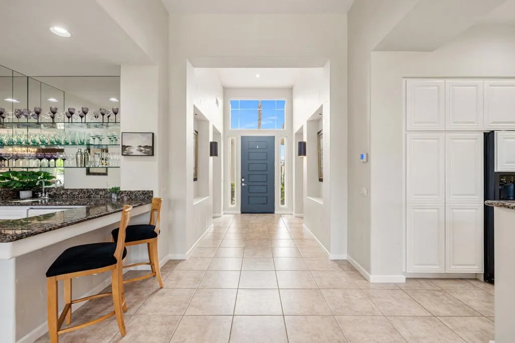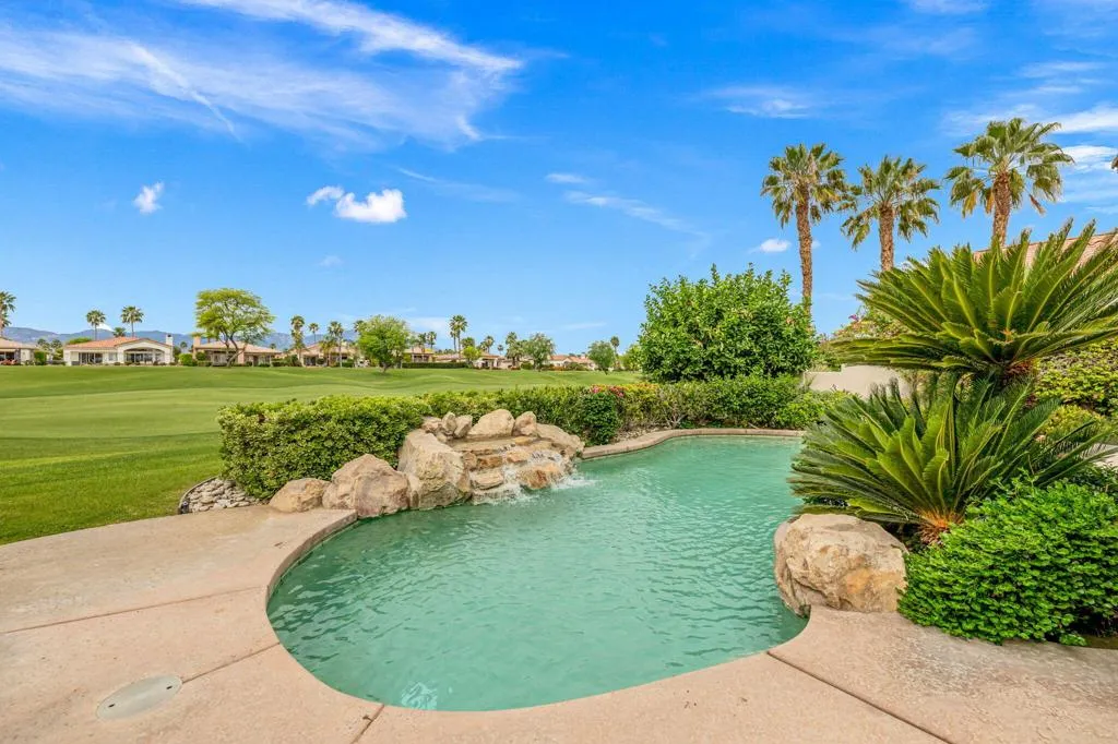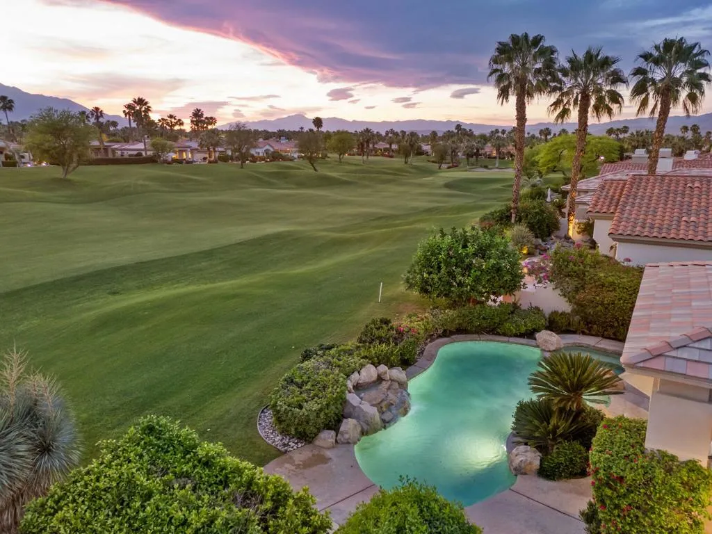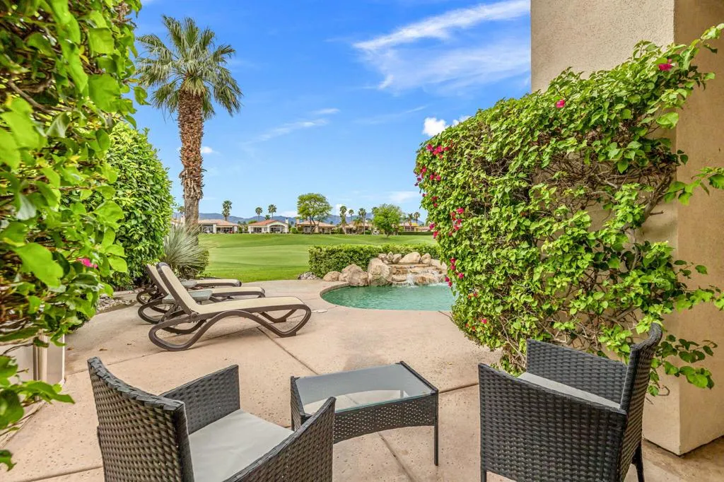 Welcome to one of the most desirable opportunities in Indian Ridge. This highly sought-after west-facing Bougainvillea 1 floor plan is perfectly positioned on the 14th fairway of the Arroyo Course, capturing breathtaking sunsets and delivering the ultimate desert lifestyle. Designed for effortless indoor-outdoor living, this home offers your own private retreat, complete with a heated pool and spa with multi-color lighting, built-in BBQ, and even a Tesla charger. Whether you're entertaining or unwinding under the stars, every detail has been thoughtfully curated. Spanning 2,430 square feet, the home features three spacious en-suite bedrooms and 3.5 baths, offering ideal privacy with separated guest suites. The generous primary suite opens directly to the spa, perfect for a quiet evening soak after a day on the course. Offered furnished and move-in ready, the home has been freshly painted throughout including cabinetry, and features granite countertops in both the kitchen and bar area. Lush citrus trees add charm and character to your outdoor space. And for those looking at investment potential, this property comes with a built-in returning tenant, generating approximately $40,000 annually. This is more than a home, it's a lifestyle, an income opportunity, and a place to truly enjoy everything desert living has to offer.