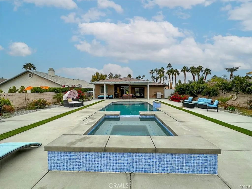 Experience the best of desert living in this stylish 4-bedroom, 2-bath residence in Cathedral City’s Panorama neighborhood. Set on an expansive lot with mountain views, this beautifully appointed home offers a seamless blend of comfort, space, and indoor-outdoor enjoyment. The open layout is filled with natural light and features spacious living and dining areas, a well-equipped kitchen with granite surfaces, stainless steel appliances, generous storage, and a large island for gathering. A separate media or lounge space adds flexibility to the floor plan, while the primary suite offers a walk-in closet and a spa-inspired bath with dual vanities, soaking tub, and separate shower. Outside, the private backyard invites relaxation with a pool, spa, covered patio, and multiple areas for dining and entertaining. A wonderful opportunity to enjoy the desert lifestyle close to local amenities.