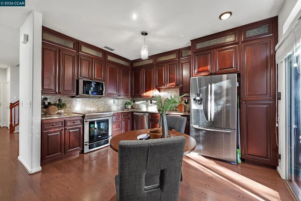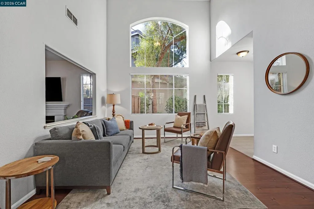 Tucked into the quiet, well maintained Canyon Park community in San Ramon, 15 Creekside Drive offers a rare end unit townhouse with 1,936 square feet of thoughtfully designed living space on a 3,260 square foot lot. This meticulously maintained 4 bedroom, 2.5 bathroom home features vaulted ceilings and an abundance of natural light, creating a bright and inviting atmosphere throughout. The updated open concept kitchen with stone countertops and stainless steel appliances flows seamlessly into the main living areas, while updated bathrooms include a separate shower and tub for added comfort. Spacious bedrooms, generous storage, and a dedicated upper level laundry room add everyday convenience. Fresh paint and pride of ownership are evident throughout. Step outside to a private garden oasis with a pavered and shaded backyard, complete with numerous fruit trees, perfect for relaxing or entertaining. Located in a low traffic, family oriented neighborhood known for safety and strong property values, and served by the highly rated San Ramon Valley Unified School District, this home is also just minutes from the Iron Horse Regional Trail and City Center Bishop Ranch for shopping and dining.