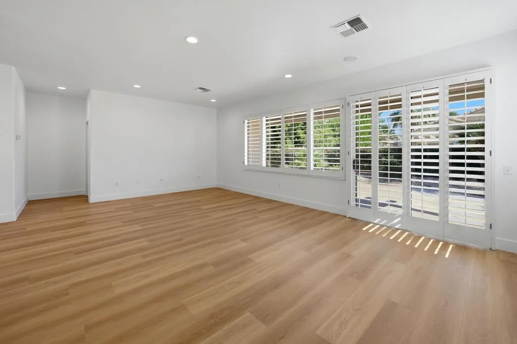 Sun City Palm Desert - St. Maarten. This beautifully remodeled and reimagined St. Maarten offers a fresh take on one of Sun City's most popular great room floorplans, blending modern design with everyday comfort. Inside, the home showcases luxury vinyl plank flooring throughout, complemented by large-format tile in the bathrooms, 6-inch baseboards, recessed lighting, plantation shutters, and fresh interior paint--creating a clean, cohesive, and move-in ready environment. The redesigned kitchen is a standout, featuring custom extended-length cabinetry, quartz countertops, a subway tile backsplash, and an expanded island with waterfall edges, breakfast bar seating, and stylish pendant lighting--perfect for both casual living and entertaining. Double doors open from the great room to a versatile den or office, offering flexibility for work or relaxation. The spacious primary suite features a bay window, a large walk-in closet, and a fully upgraded bathroom with a floating dual-sink vanity, custom-tiled stall shower with rimless glass enclosure, and designer fixtures, lighting, and mirrors. Guests are comfortably accommodated with a well-sized bedroom featuring a walk-in closet and a beautifully updated bathroom with a custom tile tub/shower surround, upgraded vanity, mirrors, and lighting. The north-facing rear yard provides a peaceful outdoor retreat with an extended patio surrounded by lush desert landscaping--ideal for enjoying the desert climate. Additional features include a laundry room with built-in storage and a two-car garage with an epoxy floor. This home delivers the perfect combination of thoughtful upgrades, modern style, and the vibrant Sun City Palm Desert lifestyle.
