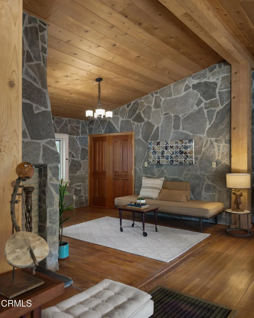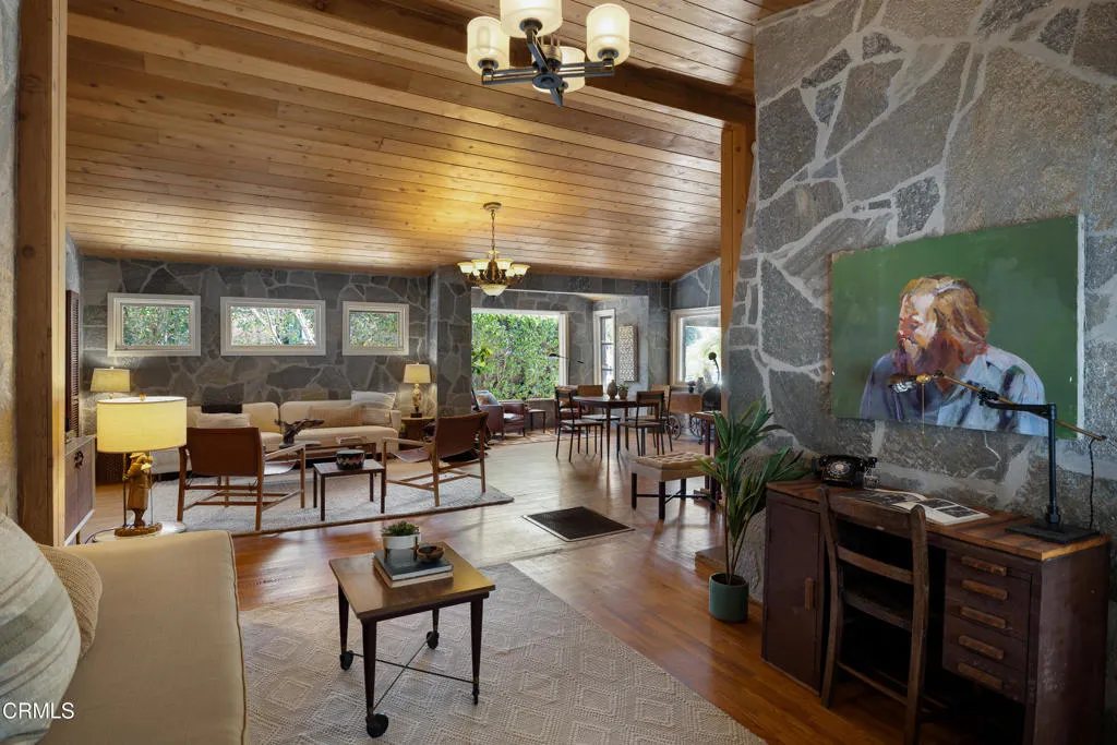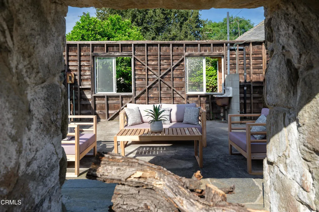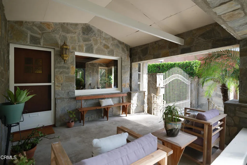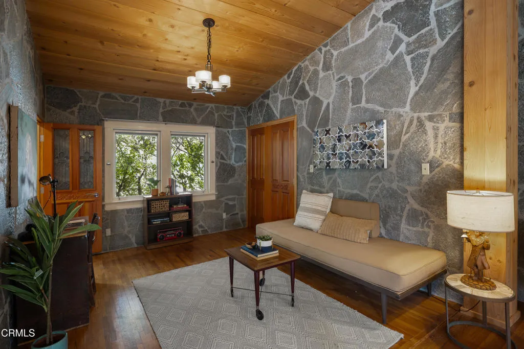 Craftsman character and creative license converge in this 1913 bungalow which has been transformed into an open concept residence with lofted ceilings and an extensive veneer of bouquet canyon flagstone inside and out. The broad, covered front porch hearkens to an age when neighbors gathered in the shade to capture the cool breezes. Mature plants and trees populate the gardens. Let your imagination flow without restraint in this once 2-bedroom 1 bath home, which feels like an artist's cabin in the woods. A stately oak front door opens to original hardwood floors which reveal the traces of change, and newer windows face mature greenery in all directions. A massive fireplace is the center of the home, and an updated bath is tucked away between sleeping areas. The kitchen and breakfast room are at the rear of the home and lead to a backyard just waiting for a new adaption. Once a 2-car garage with a workroom, only the walls remain, creating an open-air courtyard with a towering chimney right in the middle. An existing half bath was capped off, and this structure may serve as the footprint for a future ADU. A garden room and built-in barbecue area are at the rear parcel. This property is part of a trust sale, with no further probate or court confirmation required.