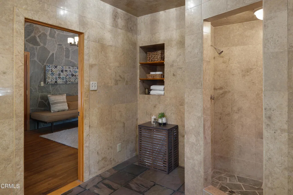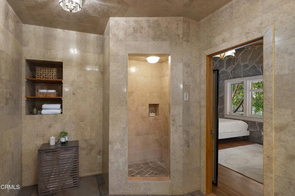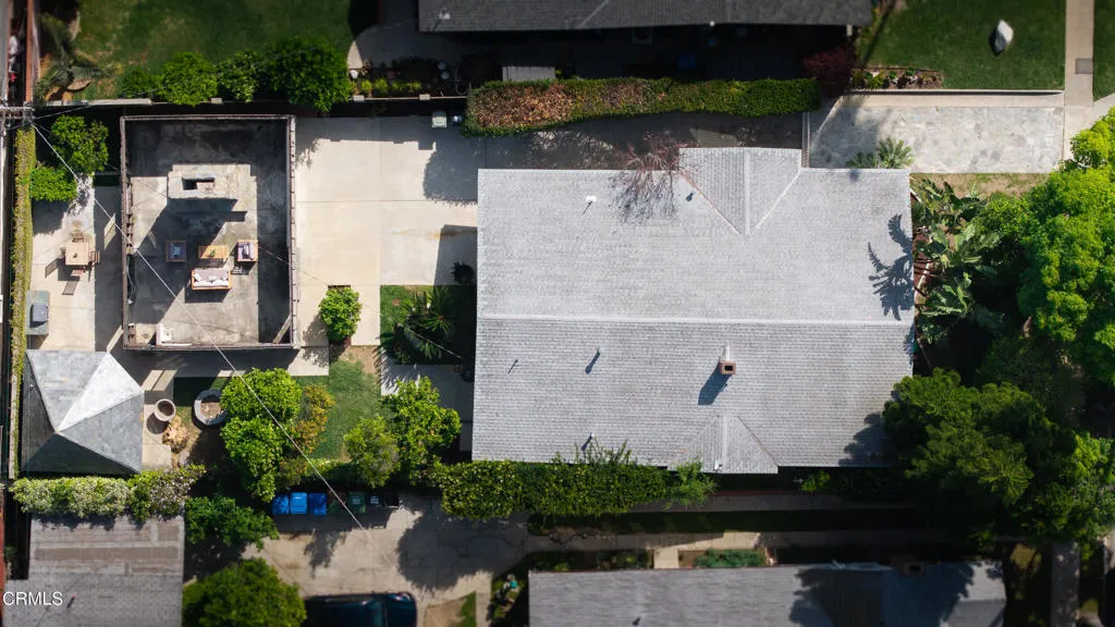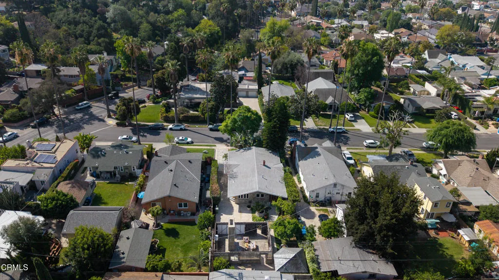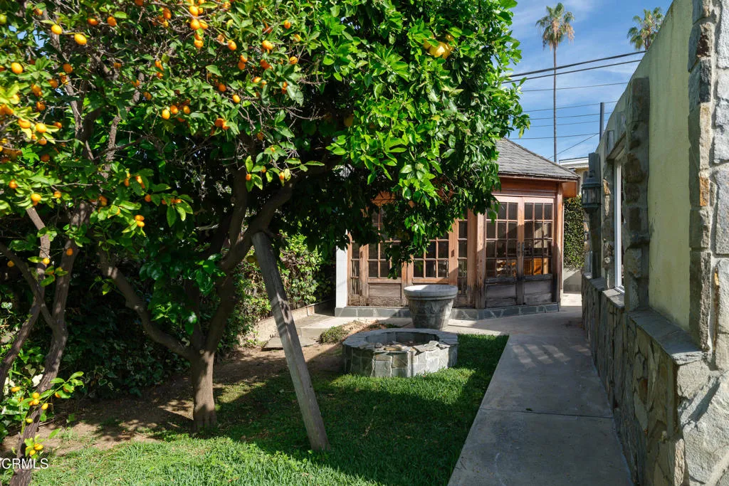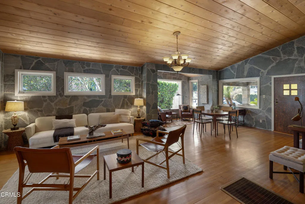 Craftsman character and creative license converge in this 1913 bungalow which has been transformed into an open concept residence with lofted ceilings and an extensive veneer of bouquet canyon flagstone inside and out. The broad, covered front porch hearkens to an age when neighbors gathered in the shade to capture the cool breezes. Mature plants and trees populate the gardens. Let your imagination flow without restraint in this once 2-bedroom 1 bath home, which feels like an artist's cabin in the woods. A stately oak front door opens to original hardwood floors which reveal the traces of change, and newer windows face mature greenery in all directions. A massive fireplace is the center of the home, and an updated bath is tucked away between sleeping areas. The kitchen and breakfast room are at the rear of the home and lead to a backyard just waiting for a new adaption. Once a 2-car garage with a workroom, only the walls remain, creating an open-air courtyard with a towering chimney right in the middle. An existing half bath was capped off, and this structure may serve as the footprint for a future ADU. A garden room and built-in barbecue area are at the rear parcel. This property is part of a trust sale, with no further probate or court confirmation required.